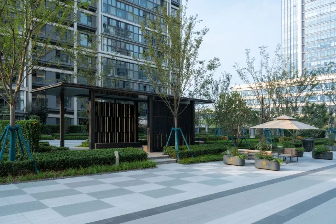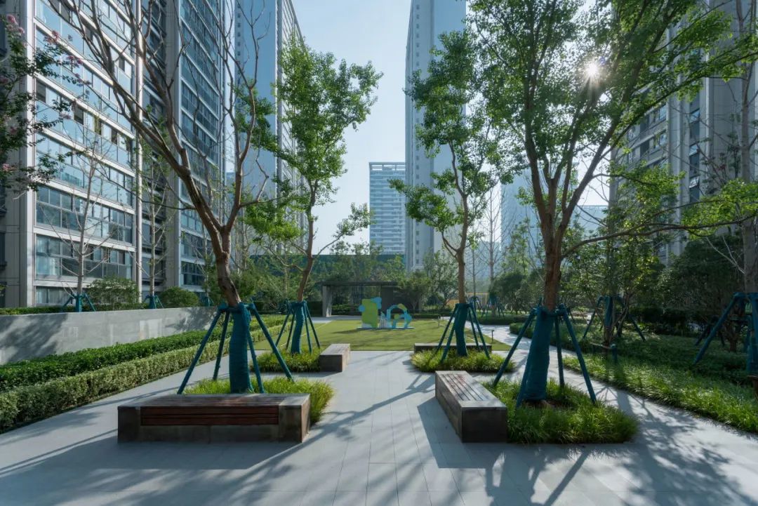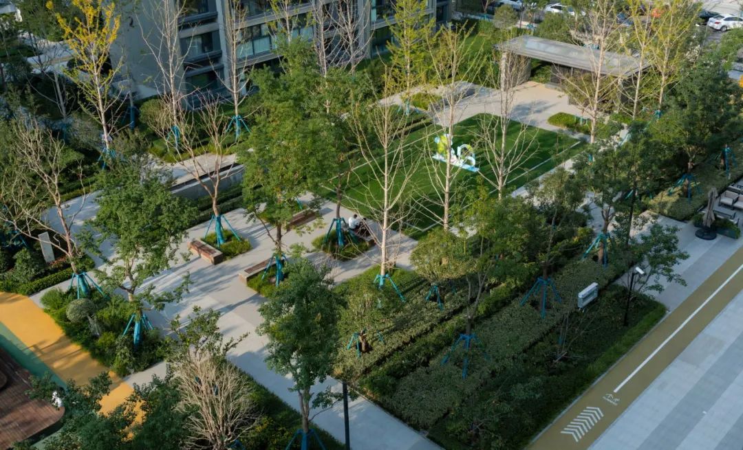 植物认知园、乌桕树阵、阳光草坪和休闲廊架有机组合在一起,形成亲切舒适的邻里休闲空间。