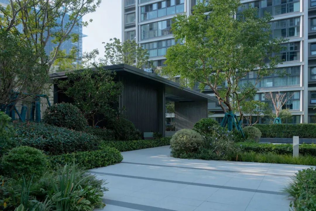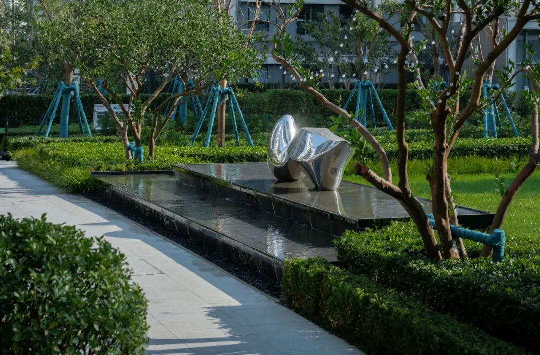 主轴的夹道树列,带领业主归家,对景的两层跌⽔和雕塑,与远处的会客廊架相映成趣。
