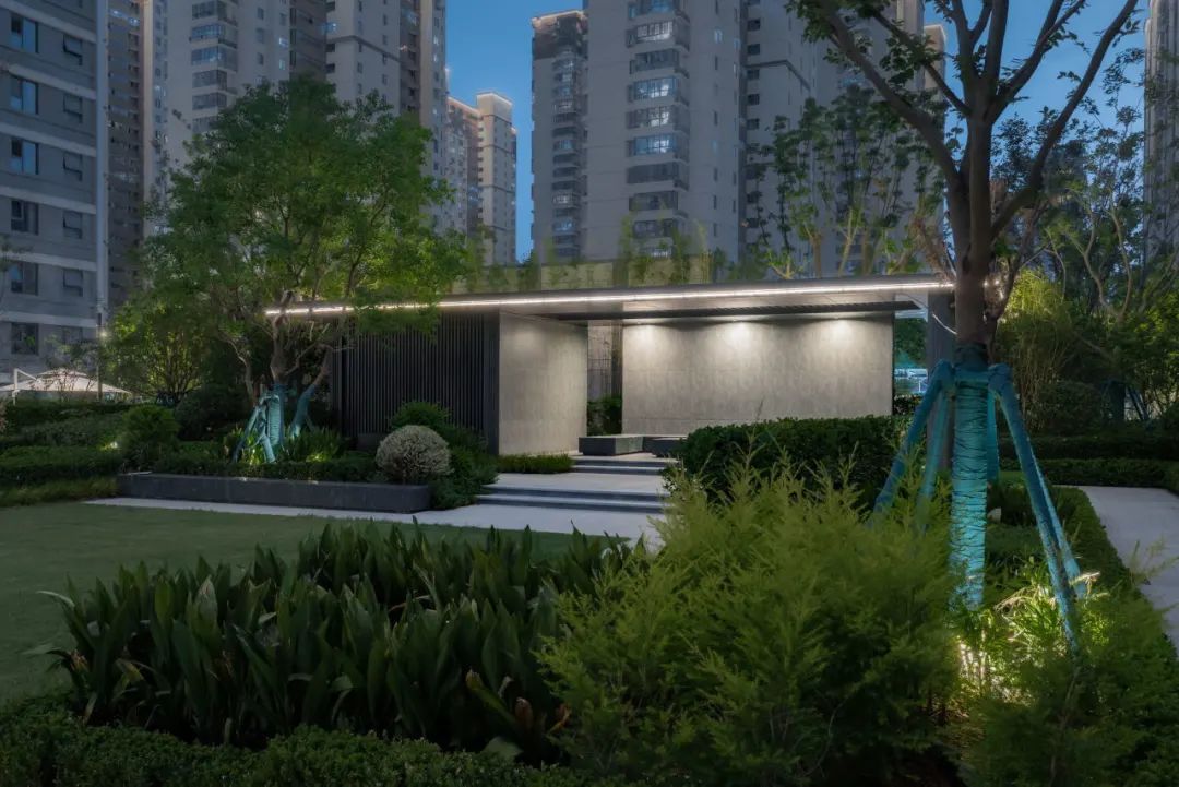 礼仪⼤道中央设置⼀处休闲廊架,既作为主轴的视觉焦点,也是社区的中央会客空间。
