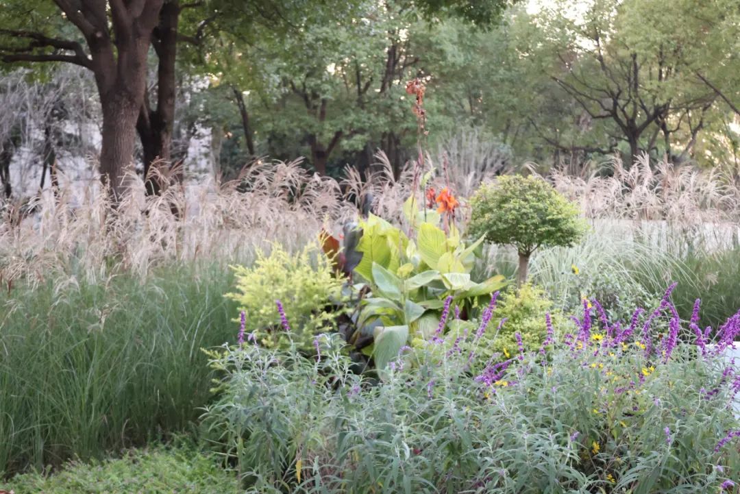 从基地现状绿化来看,植物的配比较为杂乱,需要精细化的梳理和设计,部分树种密度过高,且长势不佳,需要去除。因此,我们在树种的选择上优先考虑当地的乡土树种,采用多种类的乔灌木、地被进行合理的植物搭配,不仅从植物观赏的角度注重层次感与色彩表现,还充分考虑其实用性,引入夏季遮荫、冬季透光的落叶乔木,如北美娜塔栎、美国红枫等。