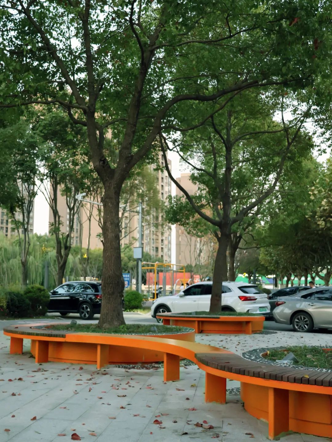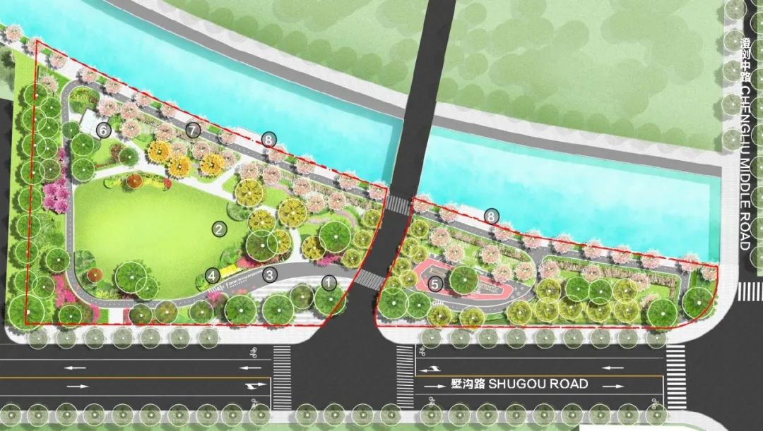 在方案的总体布局上,设计以充满活力的弧线串联东西两块用地,将两个地块中间的车行道路打开形成入口广场,打破了人行道与公园的硬性边界,让原本封闭的沿街界面变得开放。城市慢行道与绿色公共空间互相交融,成为一个柔软通透、更具包容性的开放空间。此时的城市慢行道既属于城市交通,也融于公园空间,而公园的边界既是公园开放空间,也是城市漫步道的柔性边界。