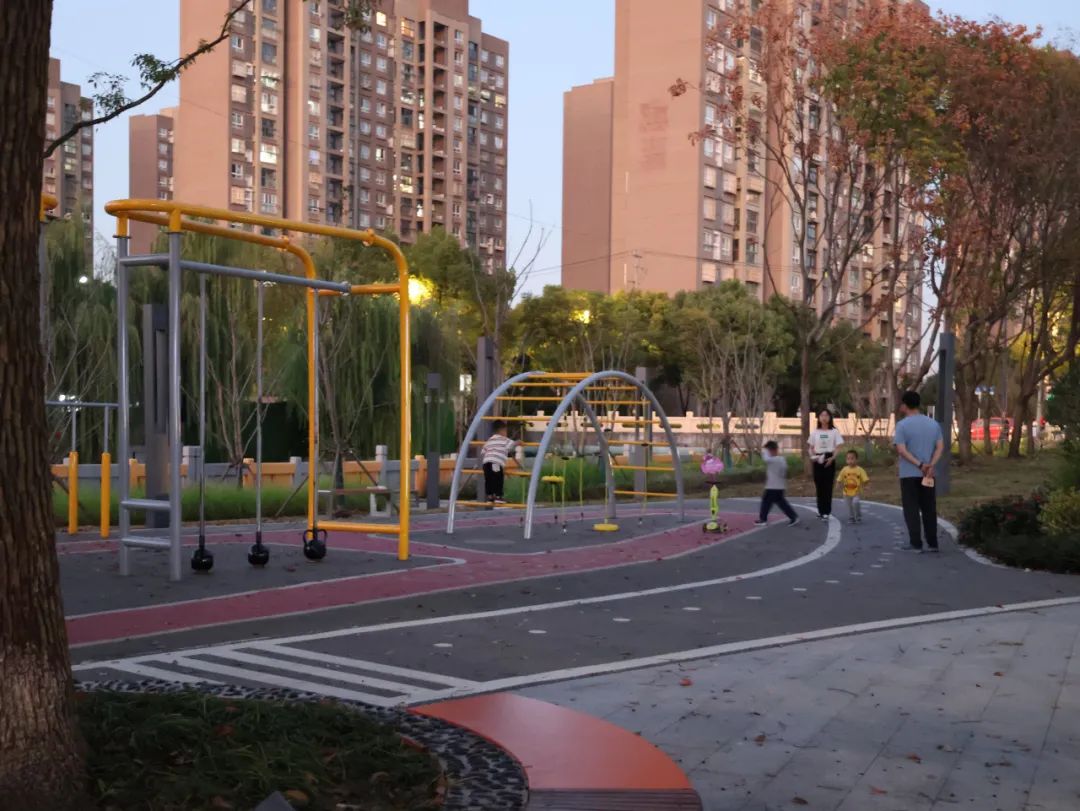 为了满足市民日常的休闲和健身需求,设计进一步完善动静功能布局,增设多元化的体育设施和休闲步道,不同年龄阶段的人群都能在此享受到健身的乐趣。而开放舒适的环境也有利于形成街道社交空间,提升周边居民生活品质感受。晴朗的午后,附近居民坐在公园里晒晒太阳,和邻居话话家常成为了他们日常生活中最惬意的一项活动。