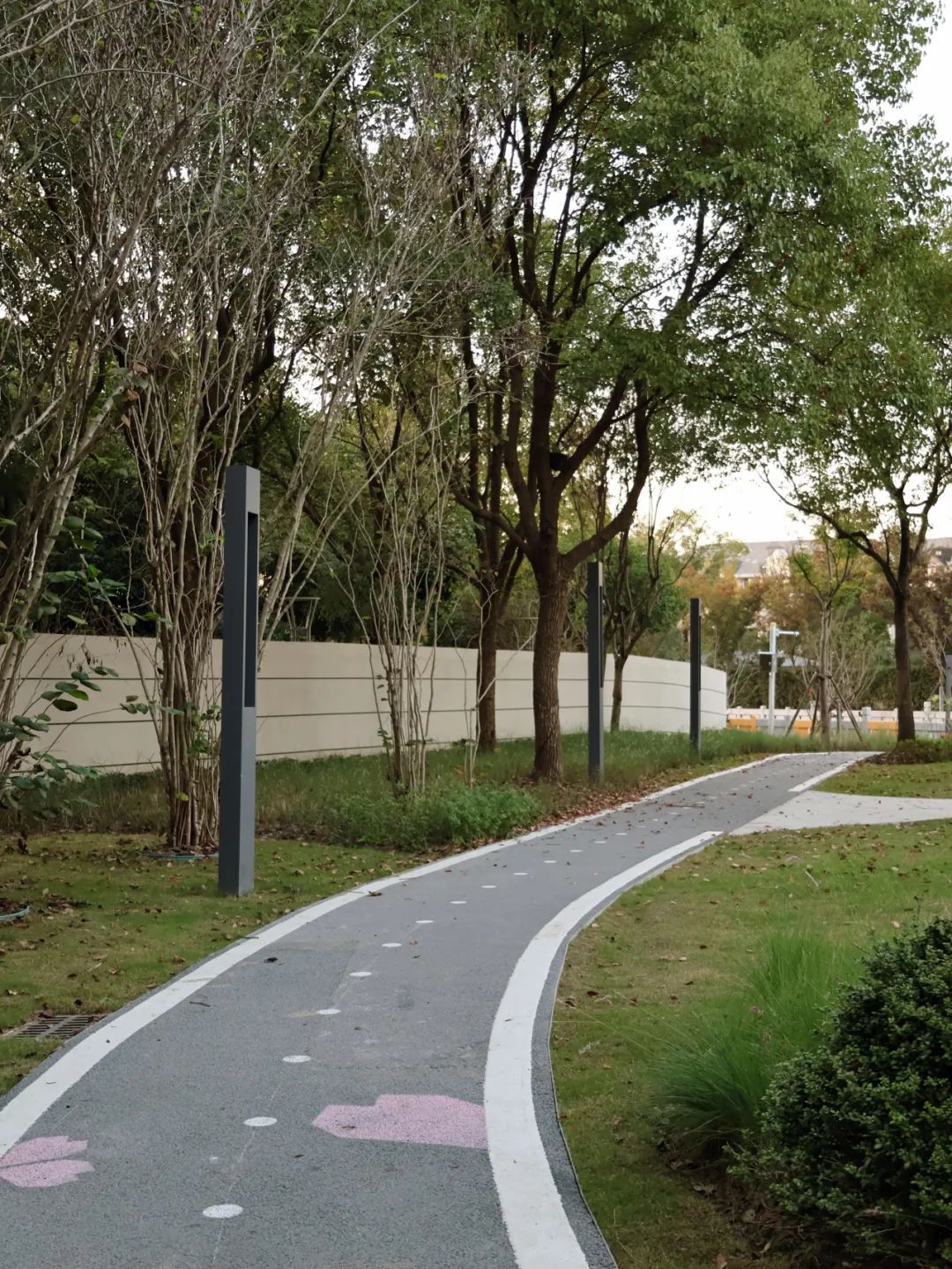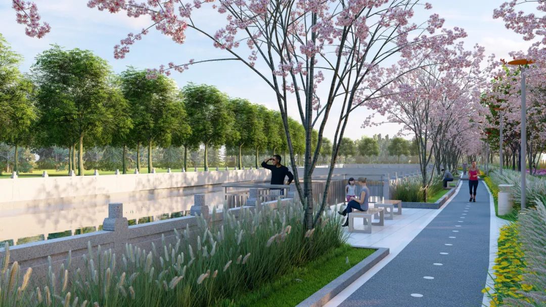 在公园沿河段步道,我们还增植了一排染井吉野樱,并设置两处观景挑台,充分利用临水驳岸空间的景观优势,让沿河漫步成为了一种愉悦的享受。来年春天,它们将会为这里染上一片浪漫的粉色。