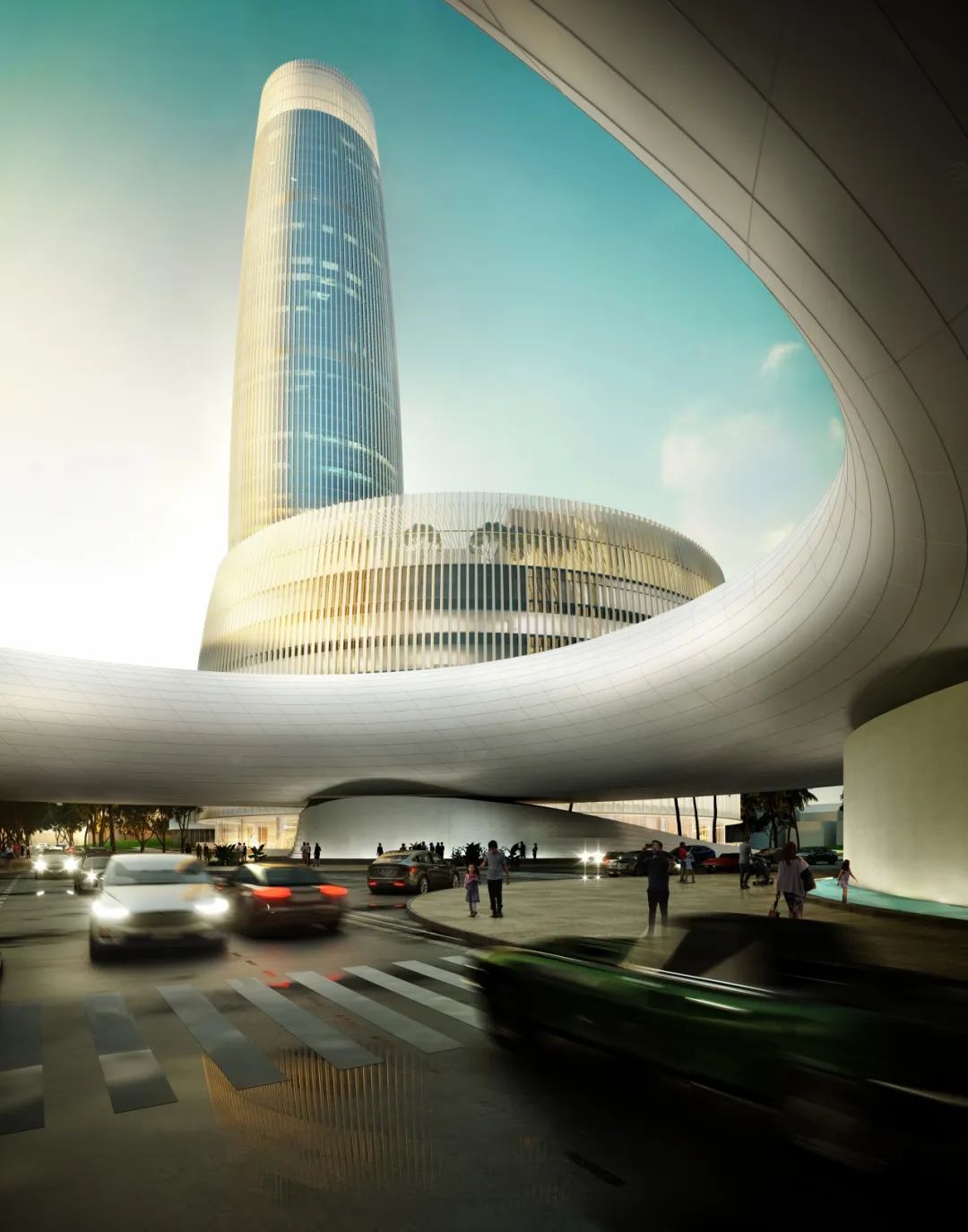 42层楼的高塔被划分为四个办公区域,顶部设有一个高大的空中大厅。空中大厅是一个多功能空间,可以举办一系列特殊活动和企业聚会。