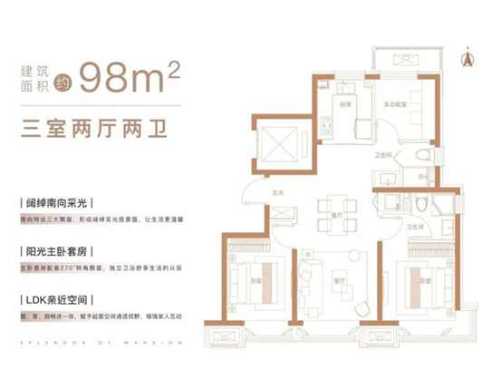 98平米三室两厅两卫:阔绰南向采光,南向特设三大飘窗,形成阔绰采光面,让生活更温馨;南向主卧套房,主卧南向套房配备270度转角飘窗,独立卫浴享生活从容;LDK亲近空间,餐、客、厨畅联一体,赋予起居空间通透视野,增强家人互动;灵动户型,供暖空间,自由转换,书房、客房、儿童房随心设计,容纳生活万般遐想。图7:98平米户型