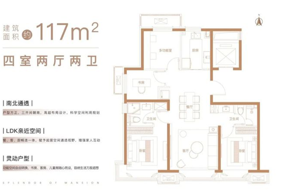 117平米四室两厅两卫:南北通透,户型方正,三开间朝南,高超布局设计,科学空间利用规划;LDK亲近空间,餐、客、厨畅联一体。