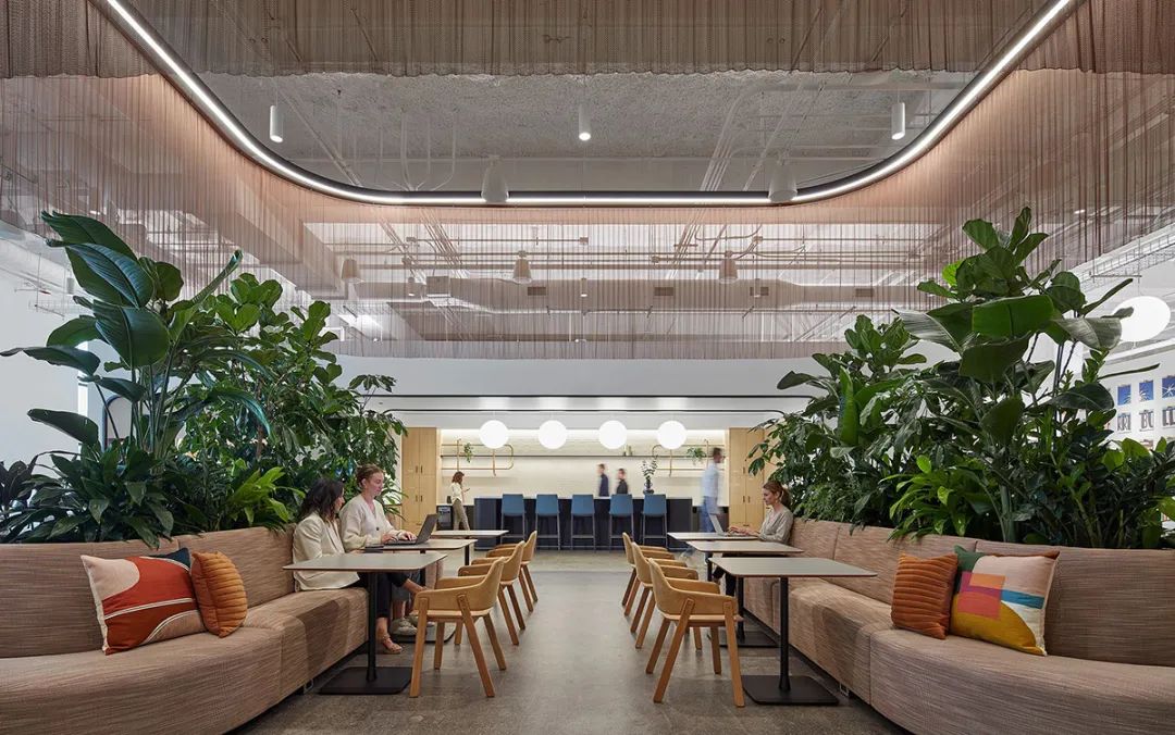 “社区”是Vizient企业价值观的核心要素,并体现在整个办公环境中。考虑到这一点,设计团队创建了“林荫大道”,这是一个锚定整个工作空间布局的横向脊柱,提供了与同事联系、协作和互动的机会。“林荫大道”由一系列引人瞩目的弯曲木肋构筑的空间场景,以及霓虹灯标志和战略性放置的以路灯为灵感的球形灯去凸显这一概念,从视觉上引导人们将这里与林荫大道联想在一起。