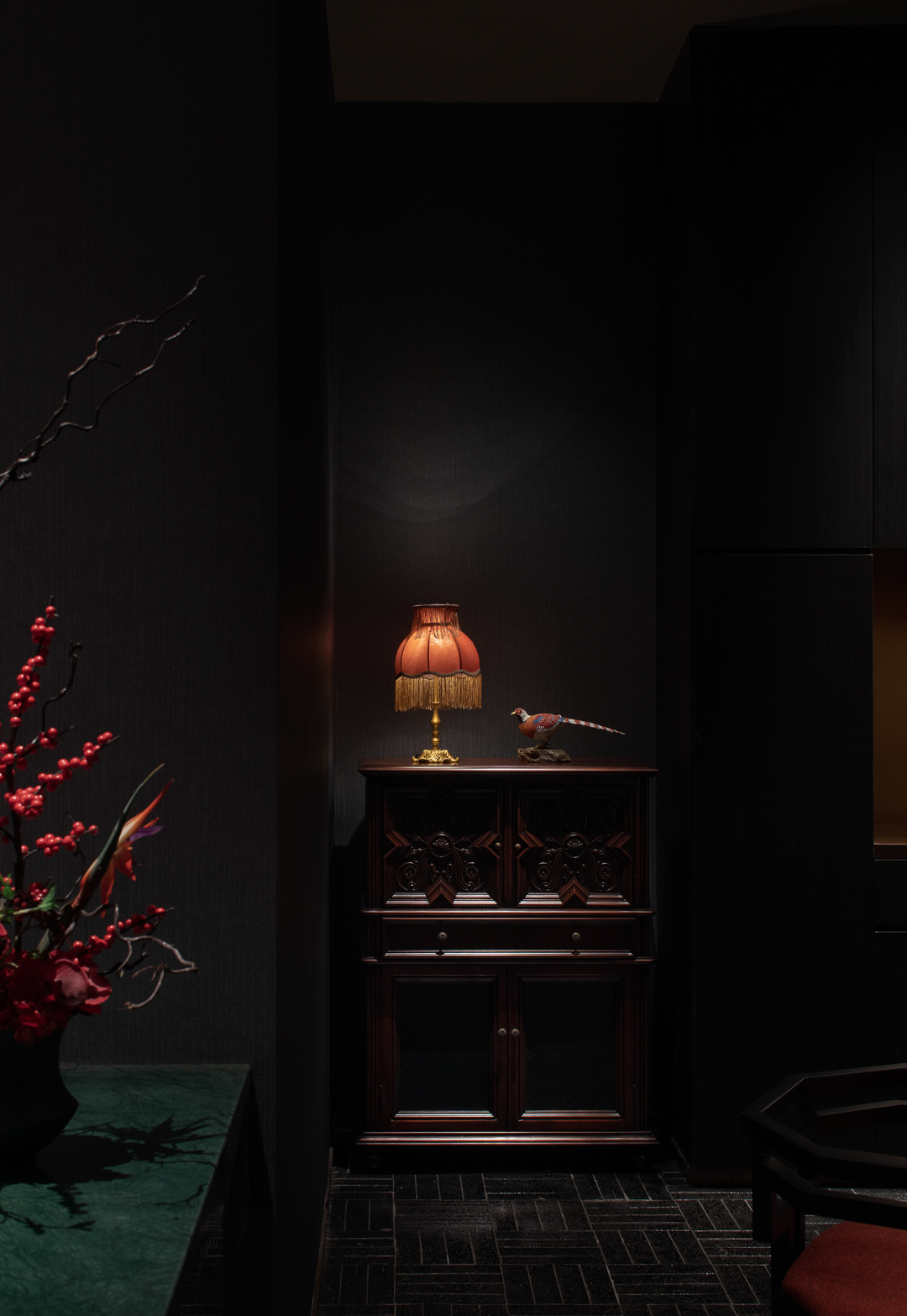 The improved dining chair and side cabinet, which incorporates Lingnan flower window elements, is in line with its characteristics, and the charm of the collision of years of precipitation and new fission emerges spontaneously. Under the halo of the light source, the combination of furnishings creates a harmonious blend of atmosphere in the space, and the materials return to their natural textures.