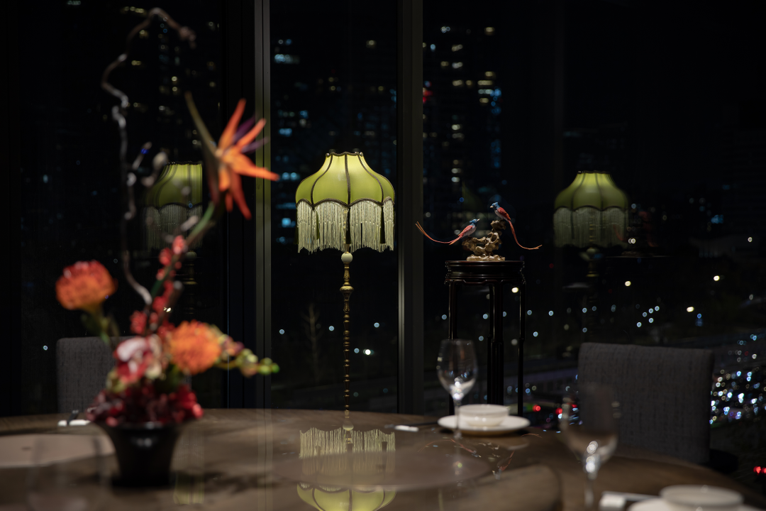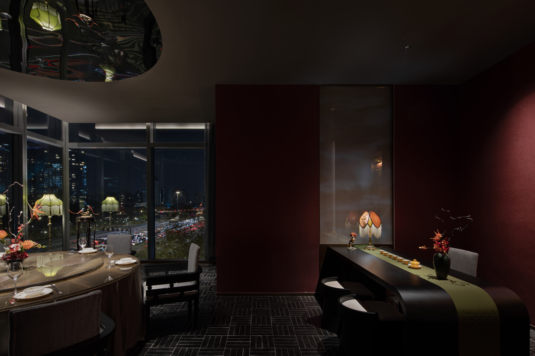 窗外无数璀璨灯光,铺构出漫天灯火的摇曳景致,赋予场域无穷的生命力与想象空间,塑造动静结合之美。