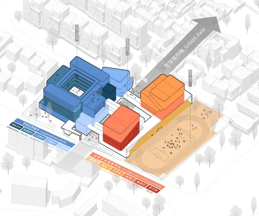 延续祥符直街肌理的中轴成为校园的公共通廊。其西侧为日常教学区,教室与办公空间环绕于方形内院布置;东侧为文体活动区,包含图书馆、报告厅、食堂、体育馆、操场。
