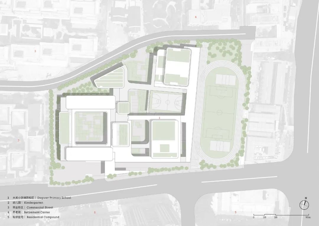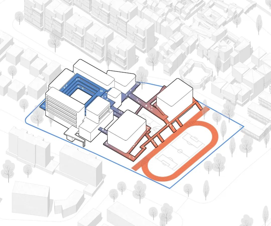 学校处于更新地块的边缘,亦即不同城市空间尺度的交汇处:南侧与东侧是大尺度的高层住区与城市高架,北侧为小尺度传统街区。基于此,建筑体量被错落布置,形成适宜的中尺度肌理,弥合周遭的城市尺度落差。