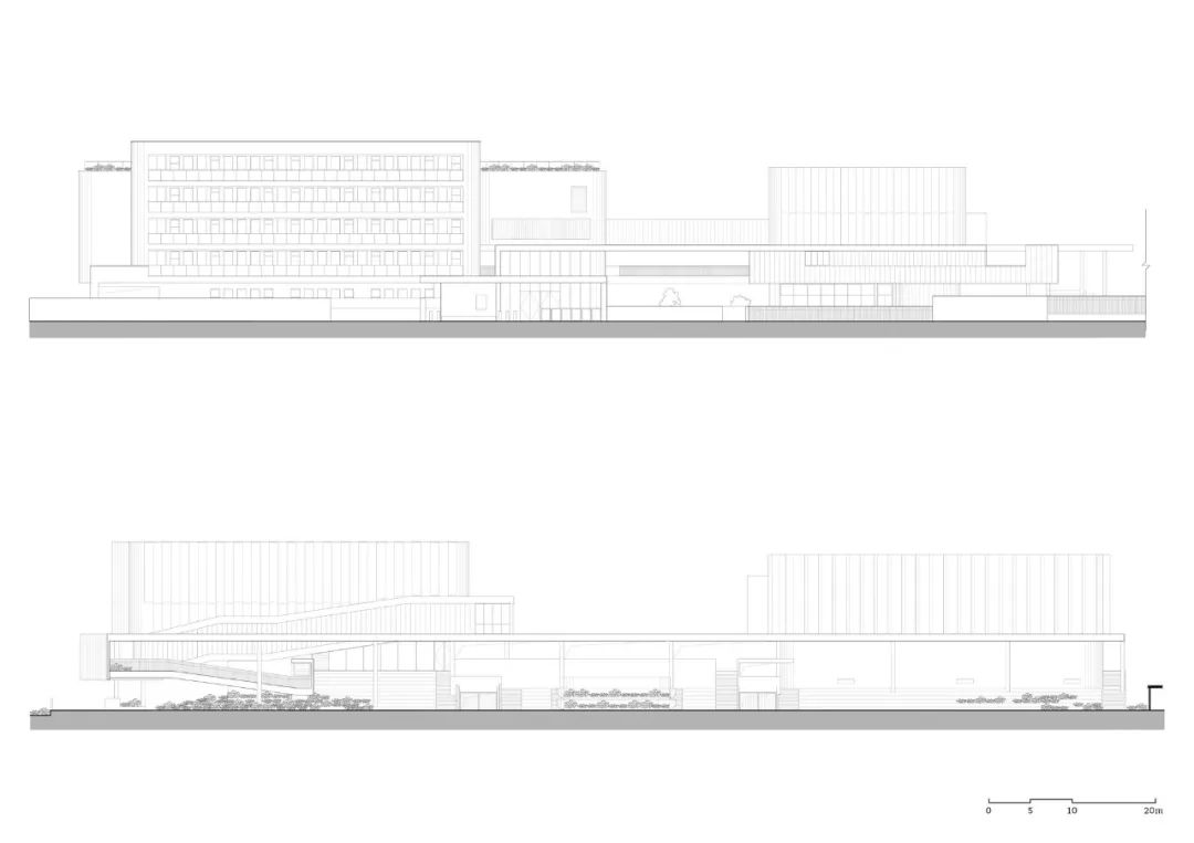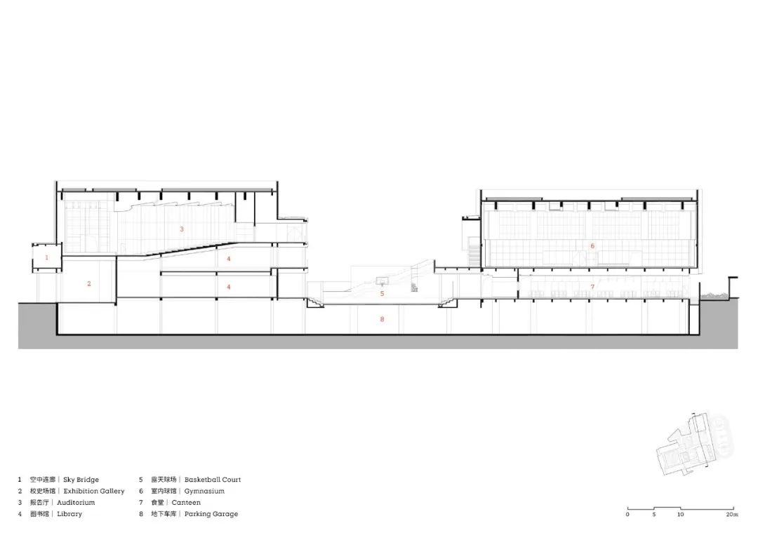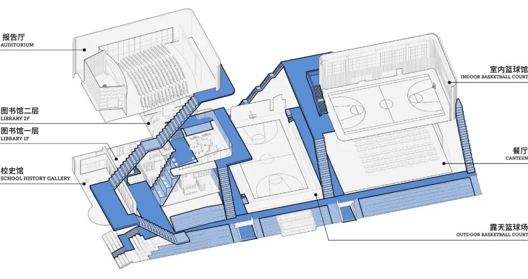 东侧文体活动区内包含了图书馆、报告厅、食堂、体育馆和操场。丰富的功能单元通过立体、环通的流线相互联系,形成一个有机的空间网络。