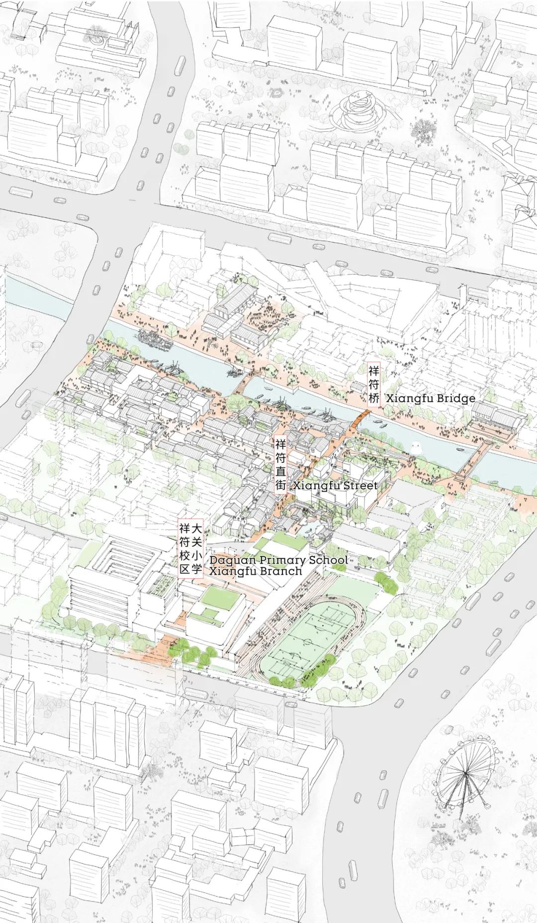 在建筑师的蓝图中,顺着这一愿景,学校的运动场、图书馆、食堂等设施将经由祥符直街与商业及滨水空间串联,共同构成一组完整的公共空间系统。