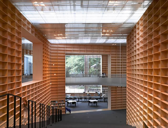 图书馆主体。书架堆积到9米高度,成为建筑墙体,形成了图书森林般的壮观场面,