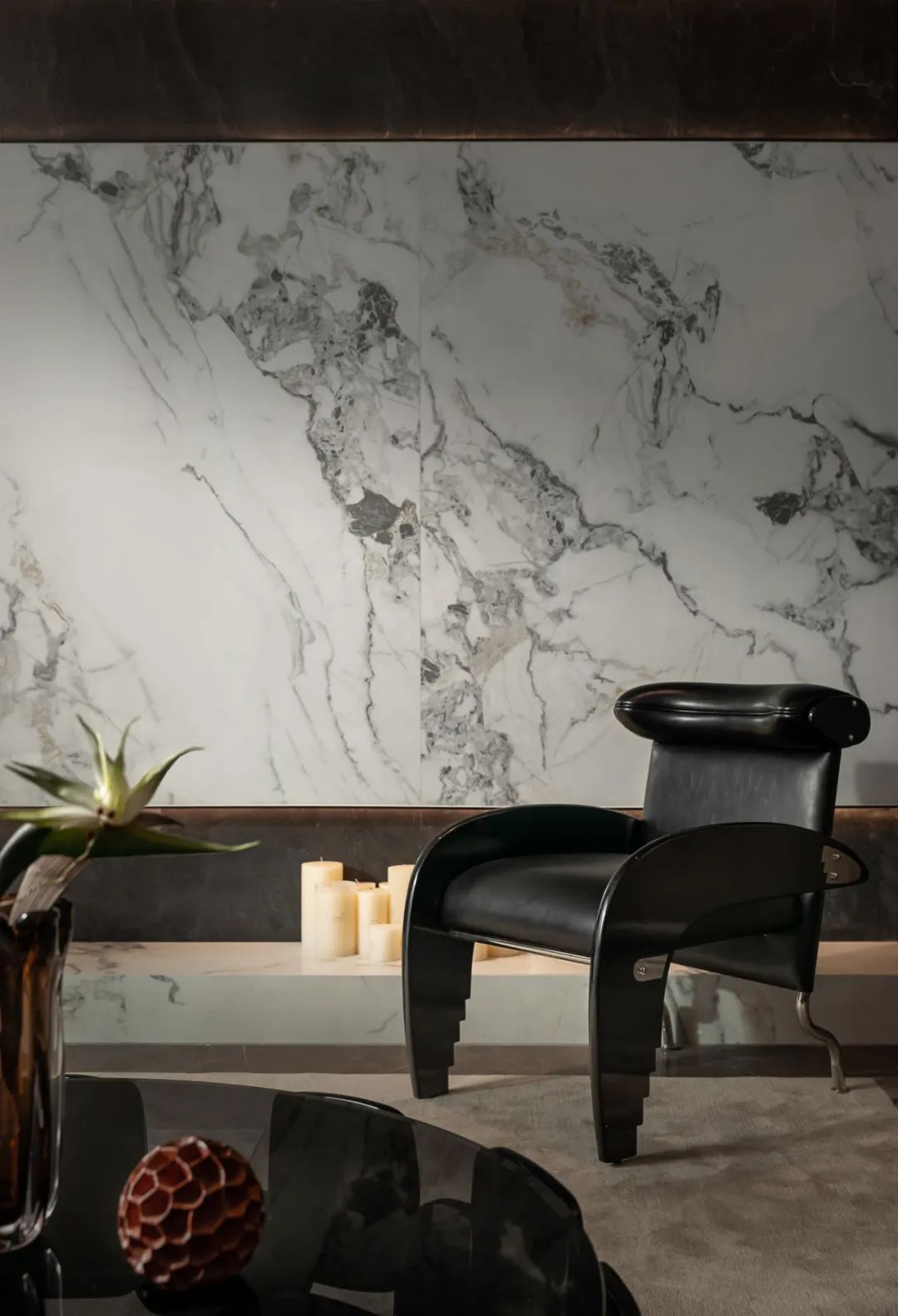 The livingroom is designed with magnificent artistic slate background wall, displaying the uncanny workmanship of nature. Simple Modern style adds the beauty of low-key luxury, material, texture, color, lines, light and shadow have a dialogue, immersive description of luxury, create a sense of ritual high-level life.