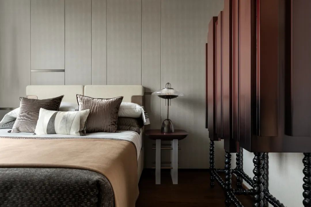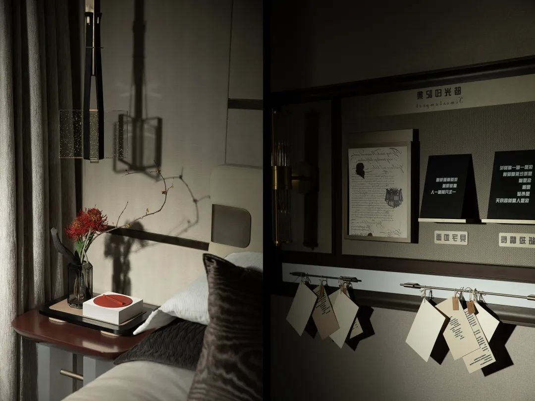 老人房空间整体基调简约素雅,比例尺度、材质色泽与艺术造型都恰到好处,设计细节与创意表达营造舒适惬意的休憩氛围,温润的木色与浪漫的暗红色创意碰撞,雅致美学成就纯粹而永恒视觉。