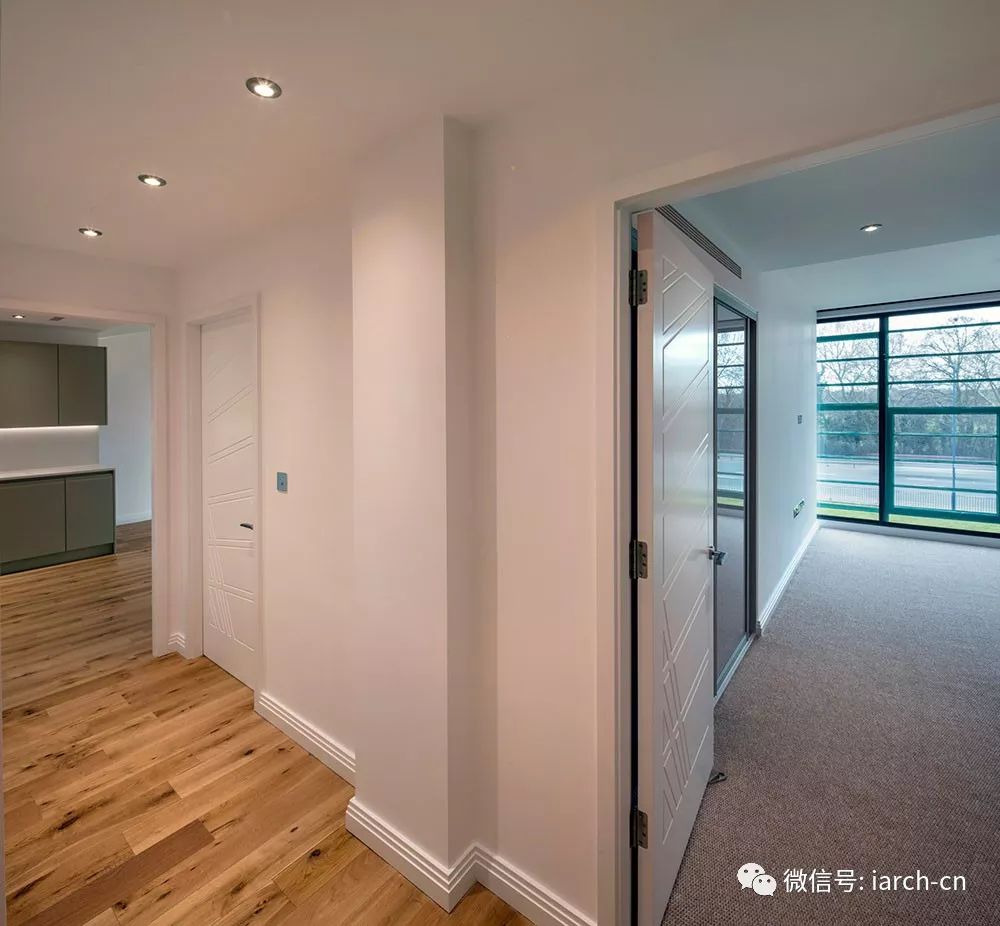 隐藏在墙壁中的预制木材桁架支撑着新增的地面与屋顶的荷载,形成14个双层公寓,使用者可以通过公寓外部的通高窗户看向室外。