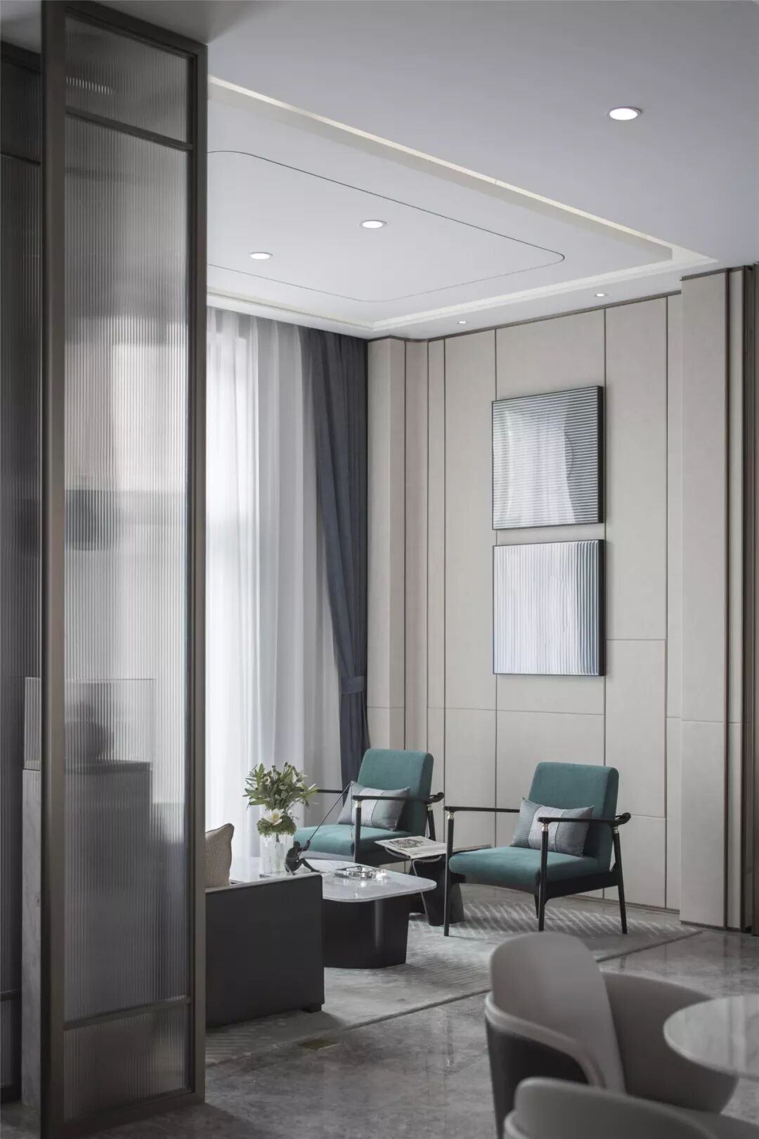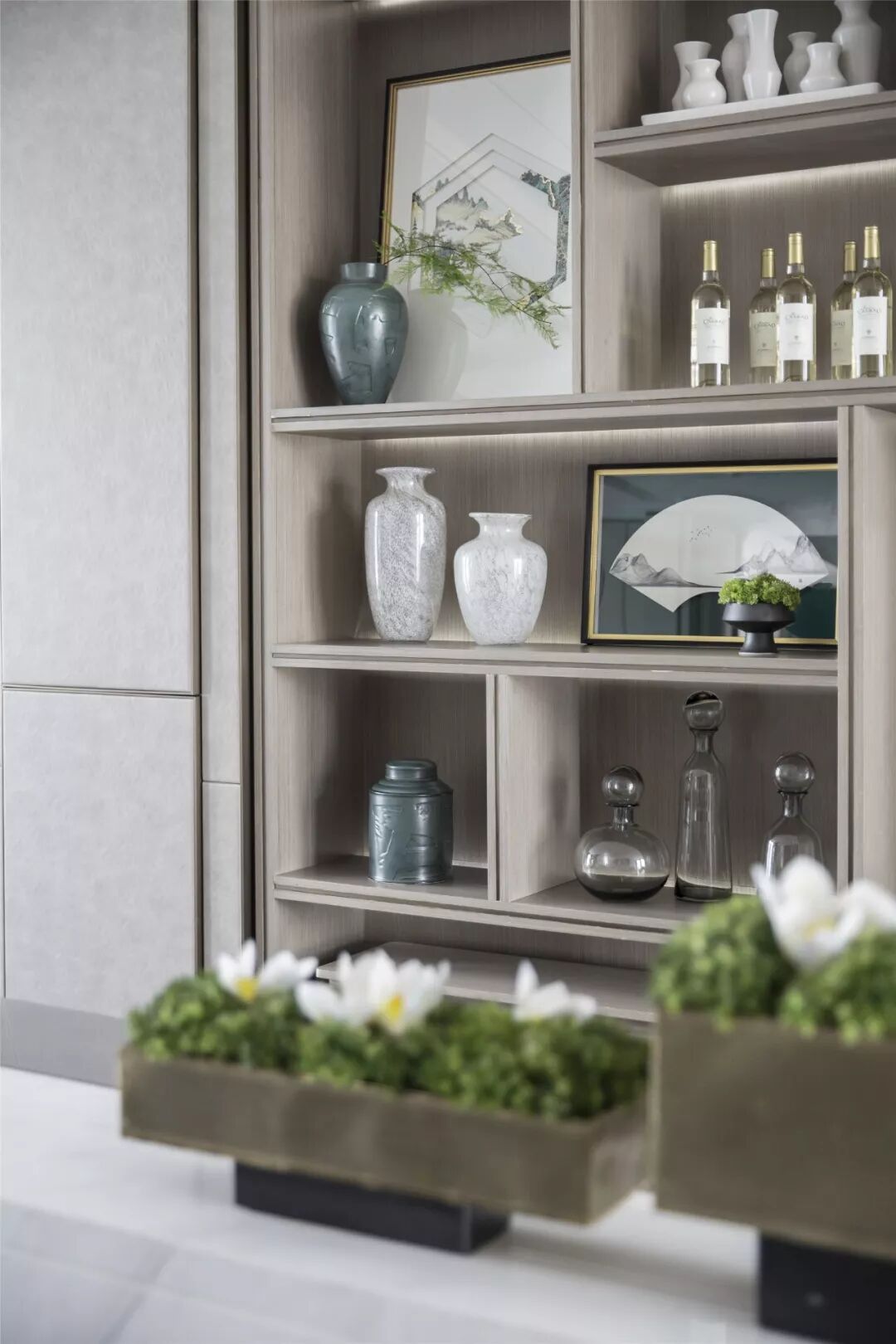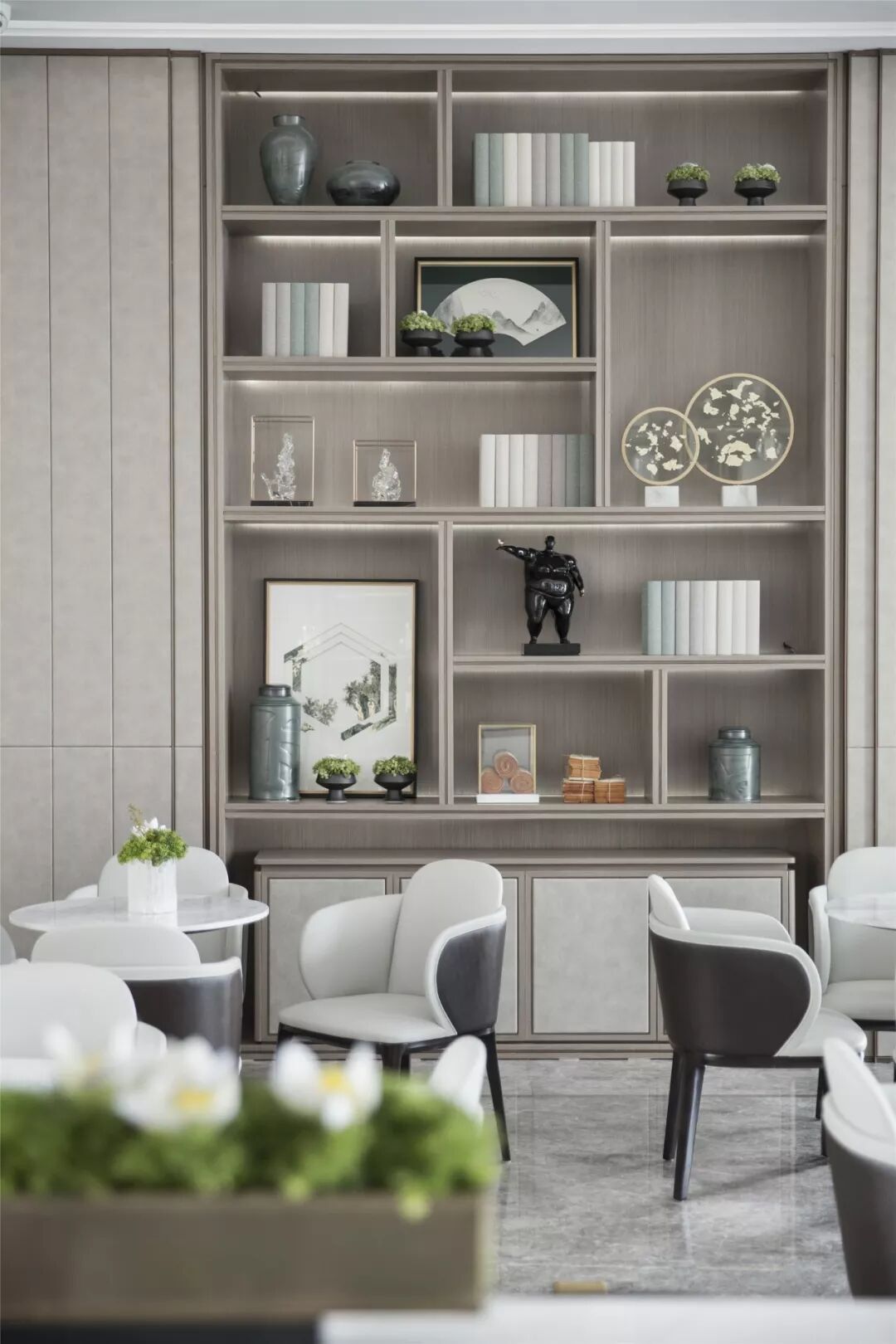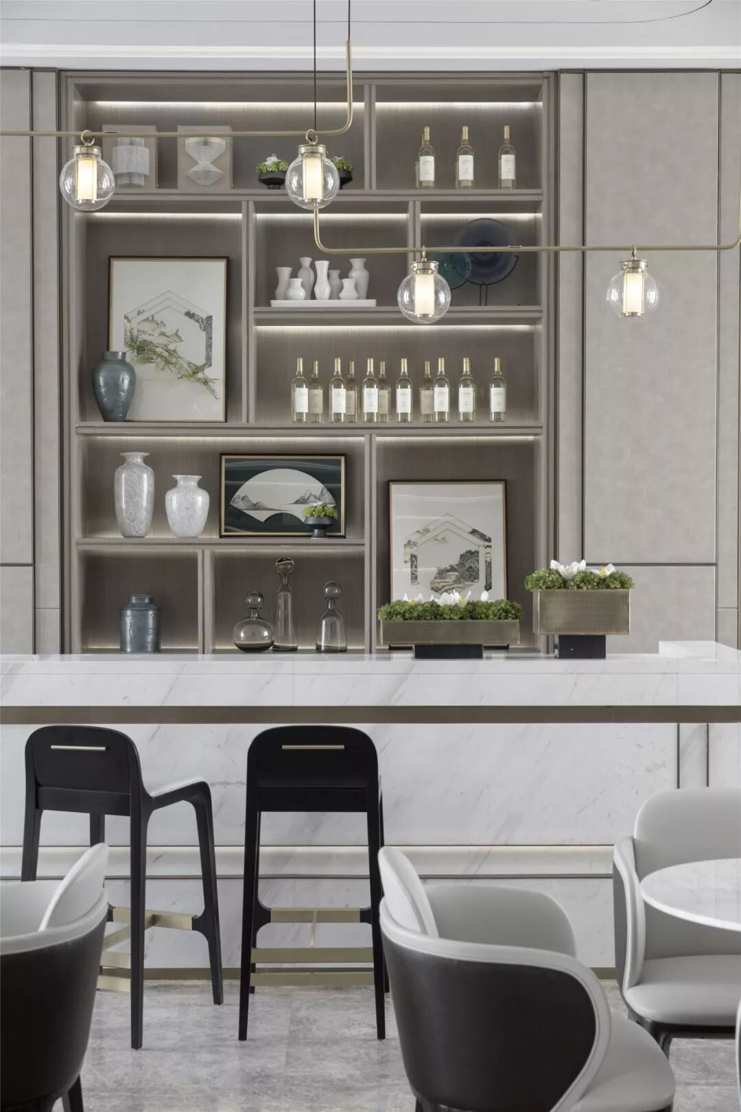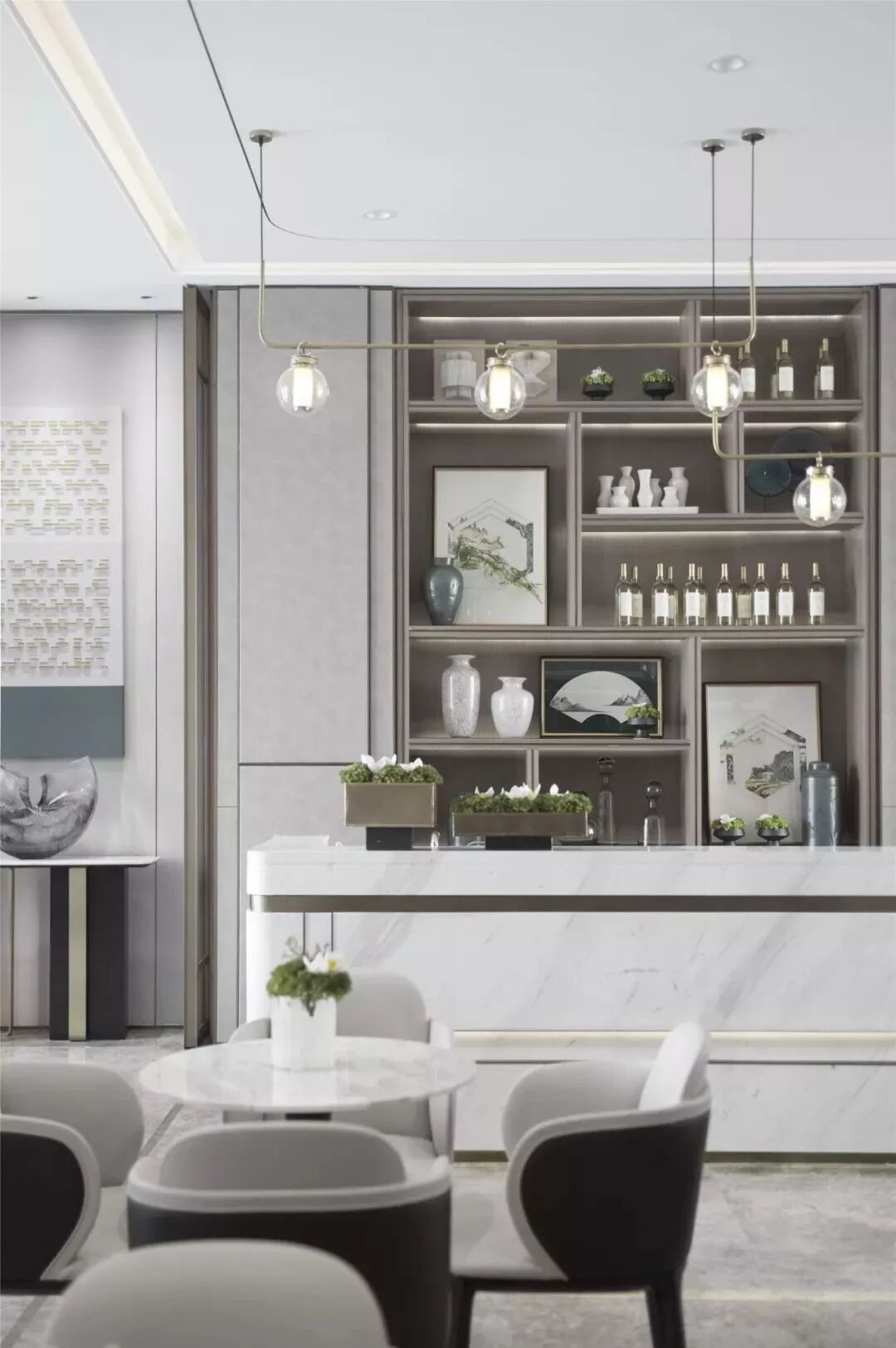 水吧台背景通过层次性排列形成韵律,洽谈区置于前方,序列的摆放与水吧台演奏出和谐的节奏。几株简单的绿植,为素雅的空间装点出活泼的气息,与摆件中的艺术画作融为一体,也成为整体空间的点睛之笔。