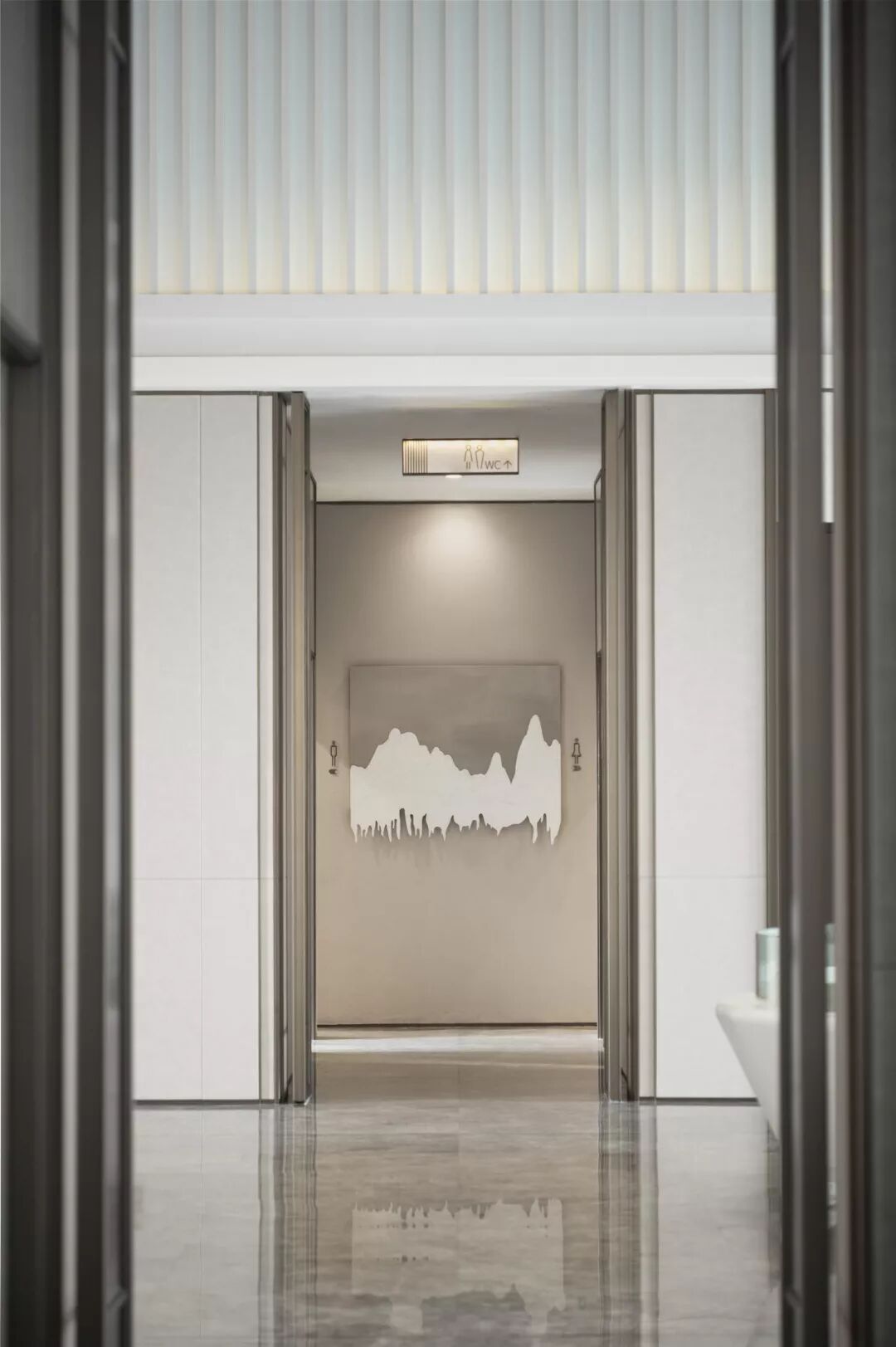 进入室内,一眼望去,木饰面与皮革交相组合穿插,整体空间以灰调为主,希望给人一种宁静的感觉。如水墨晕染般的白色石材纹理极具艺术张力,空间隐约捕捉东方的影子,又仿若印象派,将国画的留白带入到现代性的重述中。