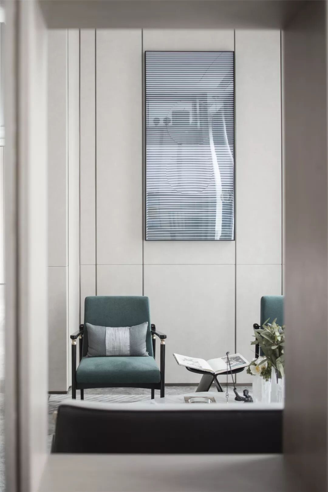 深度洽谈区以轻盈的书格构建立面排序方式,富于层次和变化,与建筑立面相融,形成一种厚重与灵动的对抗。黑、白、灰、墨绿的组合,隐匿的如玉般的温润品质,舒适的沙发组合在轻盈的空间氛围中达到了一种平衡。