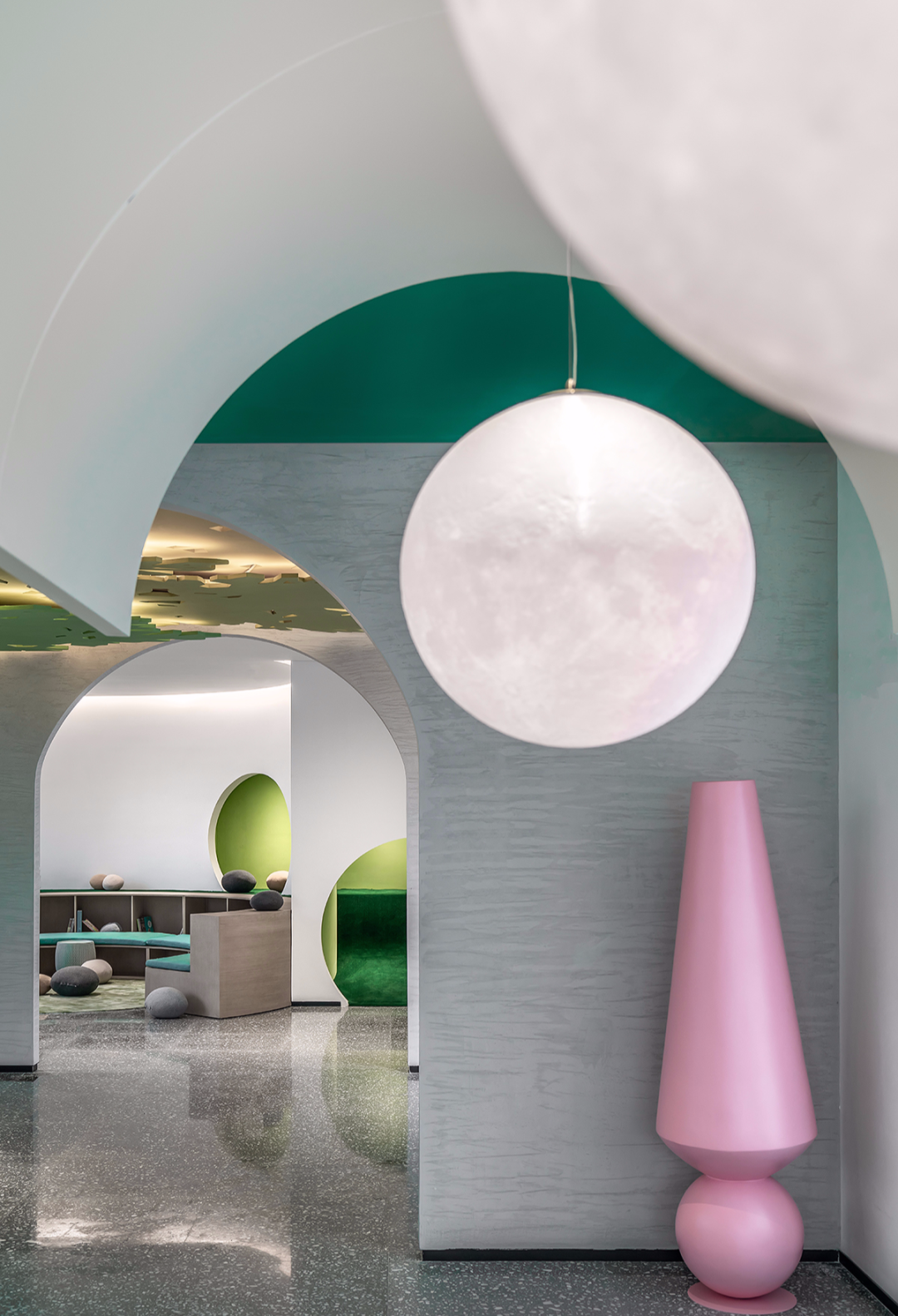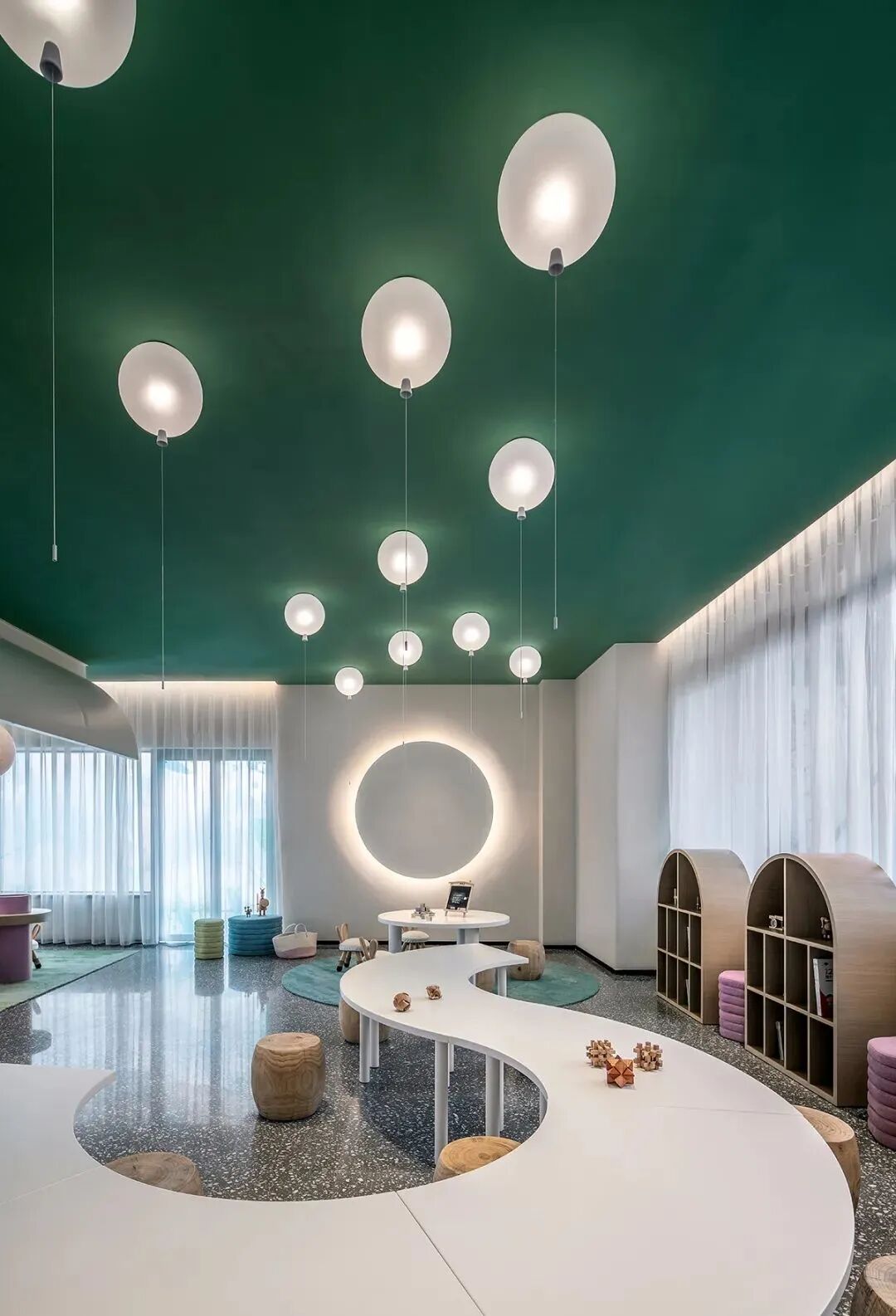 ▼儿童会所手工活动区,绿色与圆的趣味、和谐结合