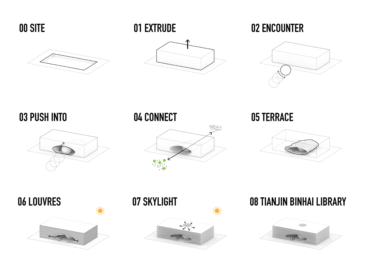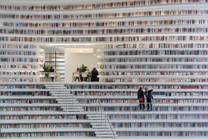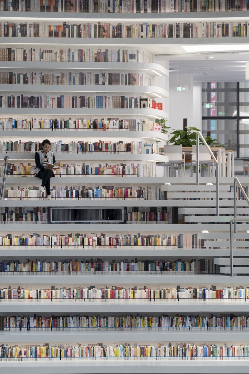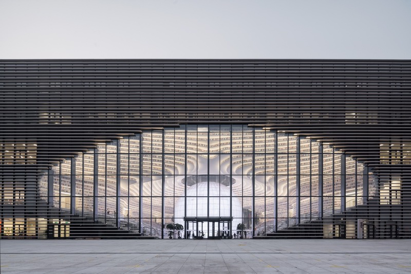 MVRDV与天津市城市规划设计研究院建筑分院(TUPDI)共同设计了天津滨海图书馆。作为建立天津市文化区域这一整体规划的一部分,这个建筑在承担教育中心功能的同时,也将成为公园与文化中心的连接体。一个椭圆形的开口直穿建筑中部,由“眼”撑开;“眼”是一个球形镜面报告厅,它矗立于中央天井内,扩大空间的视觉效果。阶田式书架呼应球体,形成了一个内部地形景观;它的轮廓向外延伸,包围建筑外部。这样一来,内部的阶梯书架在外部也被表现出来,每一层还同时起到遮光栅格的作用。