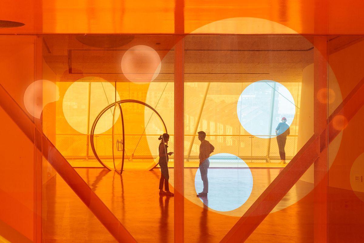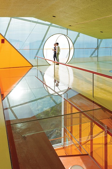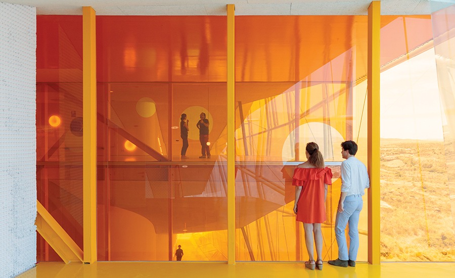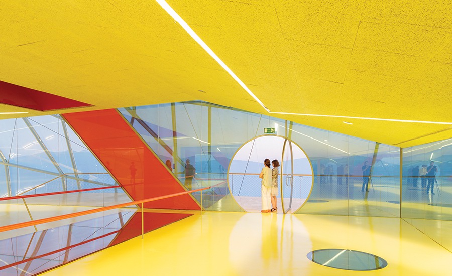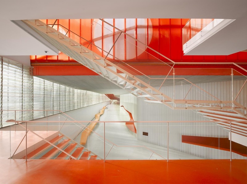 建筑内部地面与楼板都粉饰成鲜亮的明黄和大红色,再次增加与白色建筑外壳之间的对比度,形成外形与环境,内核与外形之间的反复冲撞,从荒芜走向科技。