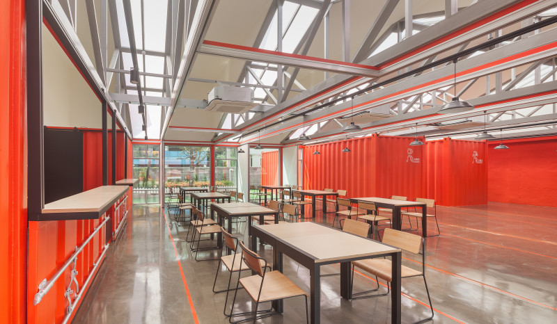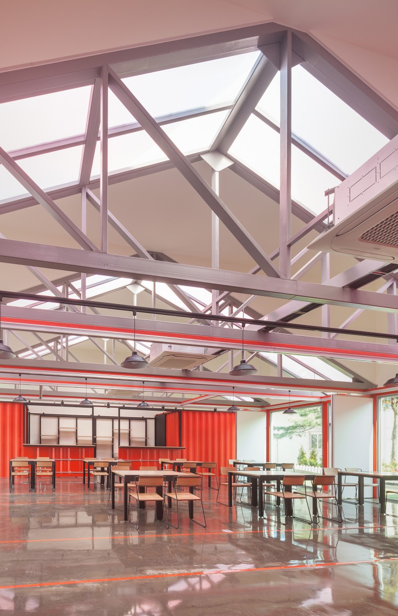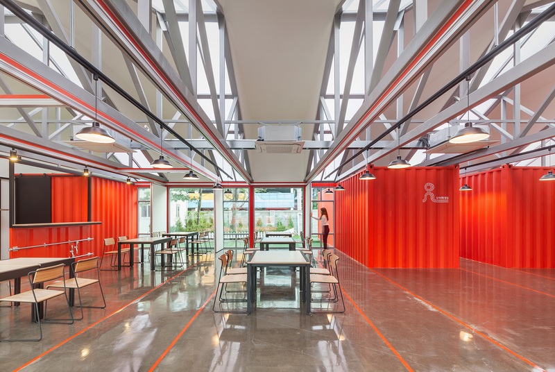 由于这里作为扩建部分,所以选择了与原有建筑相协调的暖色系并且使得自身很有标示性。五组12米长的集装箱模块“盒子”并列创造了一个连续、无柱的大空间。这里容纳了公共大厅、休息室、咖啡及酒吧就餐等功能。