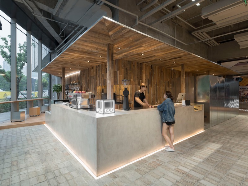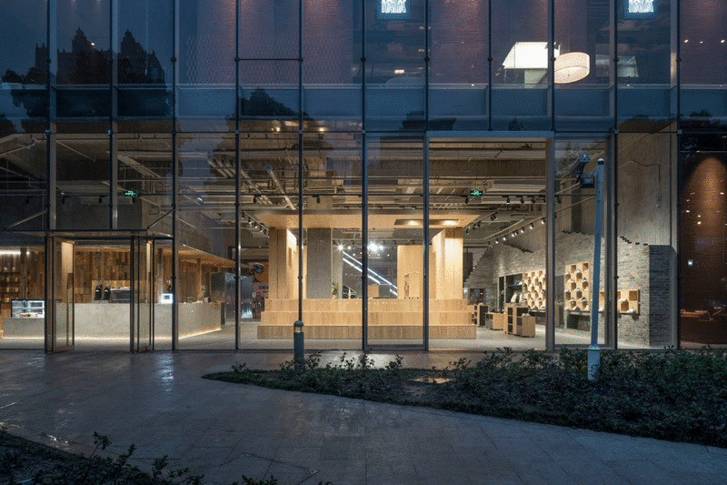 外立面的设计,保留了原建筑的玻璃外幕墙,同时在立面上增开了通高的玻璃移⻔门。当玻璃⻔门打开时,DOE店内和城市街道,形成了相对开放的对话关系。