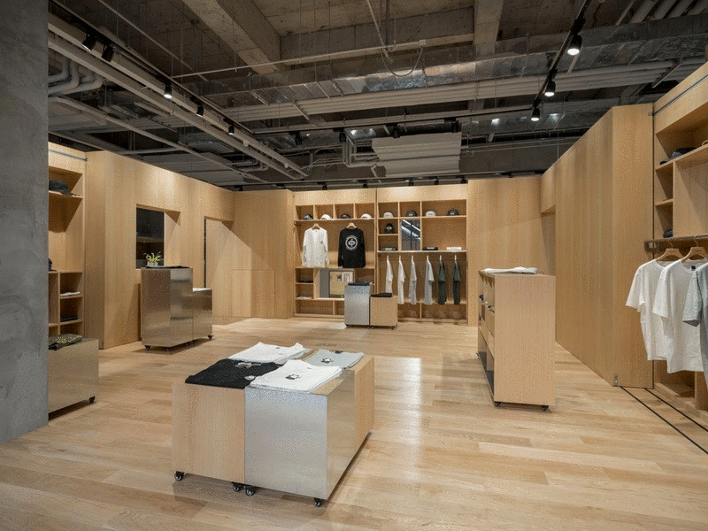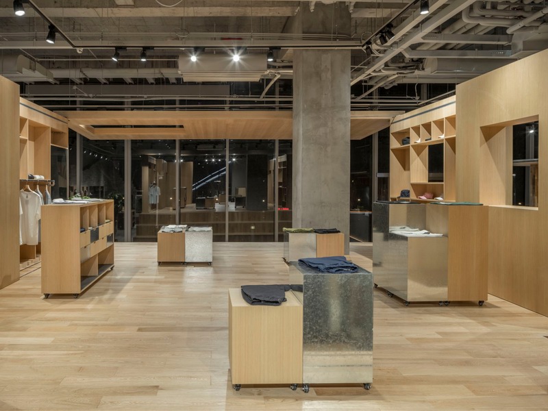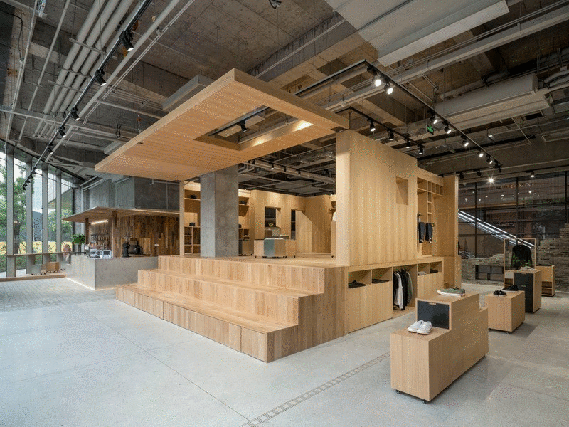 咖啡吧和收银台,还有视觉上为独立盒子的试衣间,使用老木板,水泥,镀锌钢板,灰砖等材质,营造出了浓厚的街边氛围。