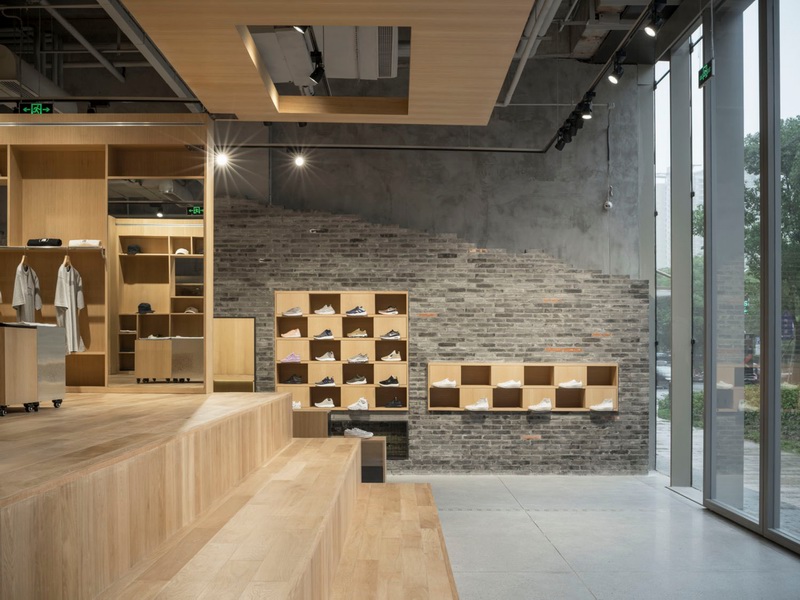 右侧部分,设计了整面的青砖墙,墙面上凸起部分的木质方体,为鞋子展示的道具。凹入的部分是服装类的展示道具。不同的材质,结合凹凸变化,营造出了城市街道立面的效果。鞋墙部分的设计兼具收纳和展示的功能,满足举办活动时的需求。