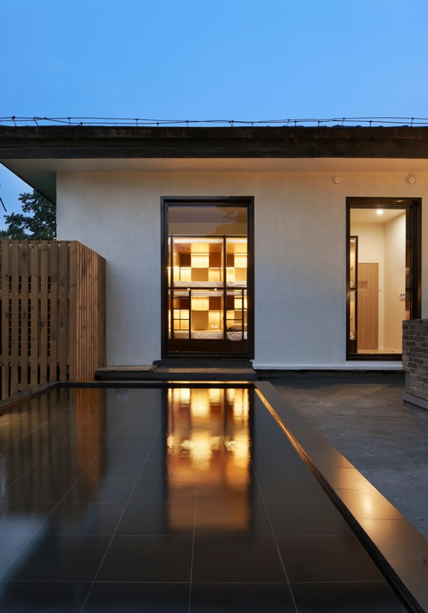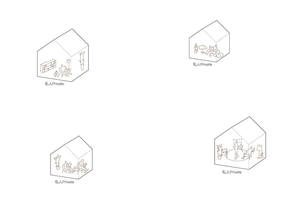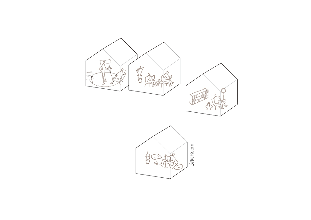 整个园⼦除了15个房间作为客房,另外超过⼀半的空间都作为公共空间利⽤,例如公共的厨房,书房,酒吧,甚⾄是公共泡池。做饭,健⾝,休闲娱乐等功能不但可以在⾃⼰的房间⾥完成,也可以在园中和他⼈⼀起以共享的模式实现,家的意义在概念和空间上都被扩⼤了。整体的功能布局在庭院从南侧⼊⼜向北侧层层递进的同时,完成公共向私密的过渡和转化。
