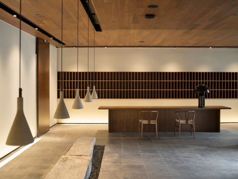 其中的亮点是⼊⼜空间,原先的停车场被改造成了⽯⼦的庭院和⽔的庭院,穿过⽵林肌理的现浇混凝⼟墙⾯,回家的客⼈从外⾯的城市节奏⾃然的转换到园林宁静⾃然的氛围⾥。⽔池中的下沉座椅,让⼈们在休息时更加亲近⽔⾯和树⽊,带来不⼀样的视⾓和体验。通过庭院的改造,动和静,城市和⾃然,达成了最⼤程度的和谐。