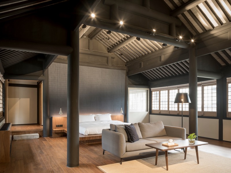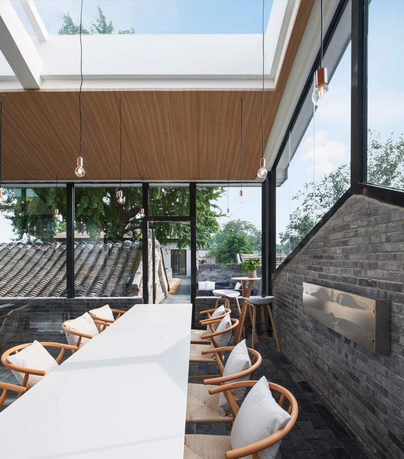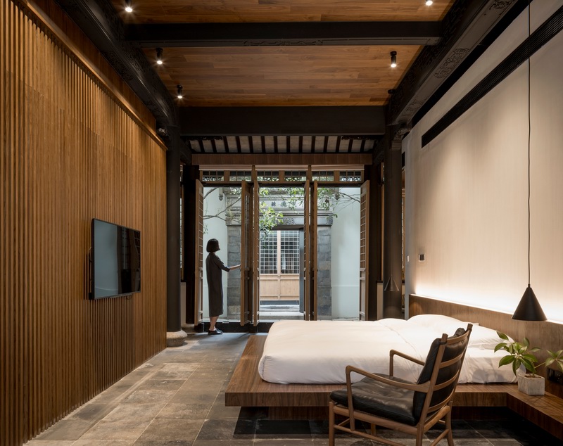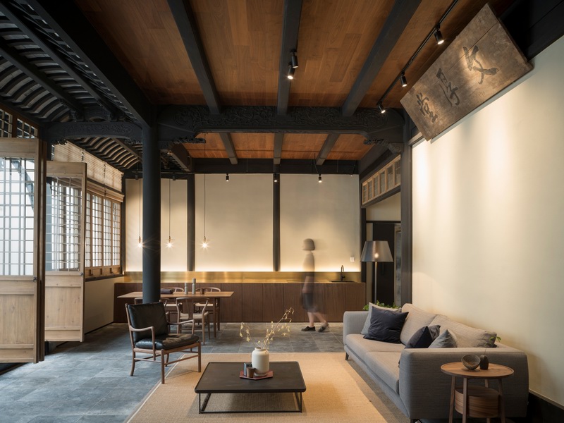 整个宅院在历史上是属于⼀户⼈家的私宅,虽然要改造成现代公寓,但设计理念是希望延续⽼宅原有的精神和空间体验感,⽽不是将宅院割裂成⼀个个孤⽴的客房。对于每个⼊住的客⼈,不仅有⾃⼰的私密空间,更能⾛出来在整个园⼦⾥与其他⼈交流。