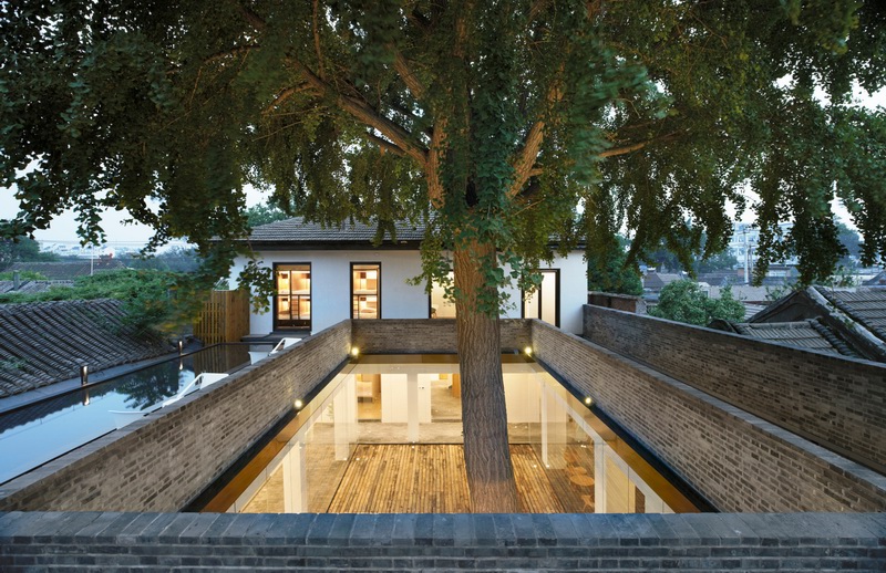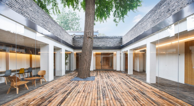 设计基本沿⽤了原有的庭院布局。对于清代古建改造部分,设计保留了全部的⽊结构,并在内部增加了增加空调和供暖系统,以及卫⽣间淋浴间等现代⽣活所必需的功能。外⽴⾯改造去除原有⽊结构表⾯的暗红⾊油漆,改为传统⼤漆⼯艺做的⿊⾊,与原⽊⾊门窗结合,展现出⽼宅古朴素雅的⽓质。室内材质的选择⽅⾯,采⽤⿊胡桃⽊材,天然⽯材等⾃然材质,忠实于材料本⾝真实的质感,延续古朴的氛围。