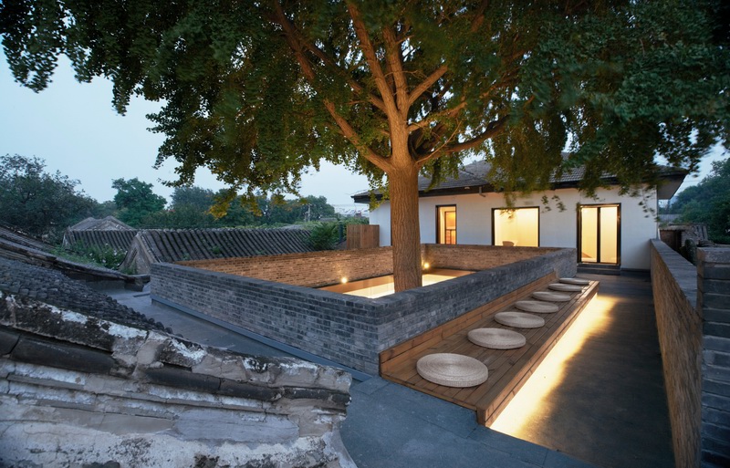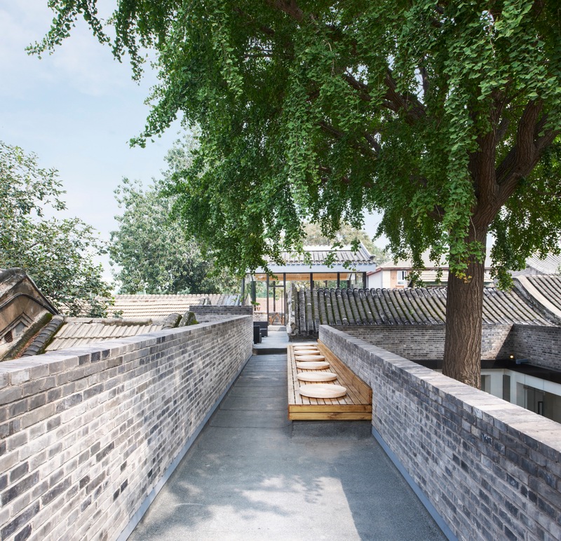 院子是“四合院”建筑的居住乐趣所在。顺着廊道来到后院,东侧角落坐落着一处被青砖包围的景观空间。穿过后院,通过南侧楼梯上到二层。二层的露台由一层廊道屋顶连通而成,形成坐于屋瓦之间、树荫之下的典型北京胡同文化体验:夏听蝉鸣,冬看白雪黛瓦。