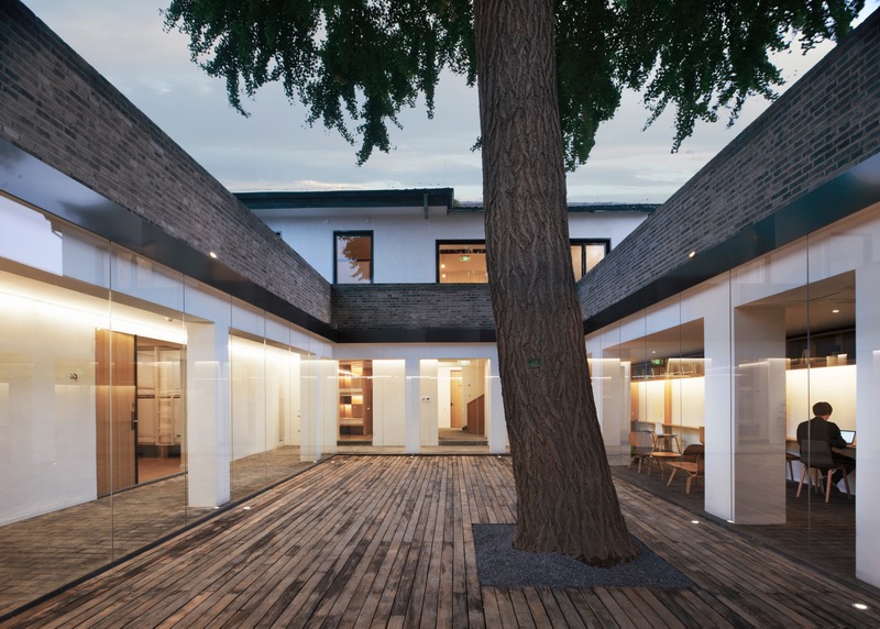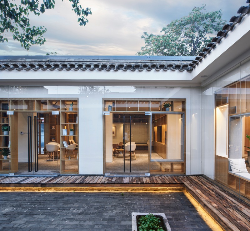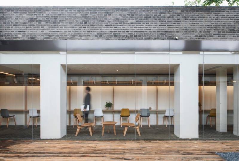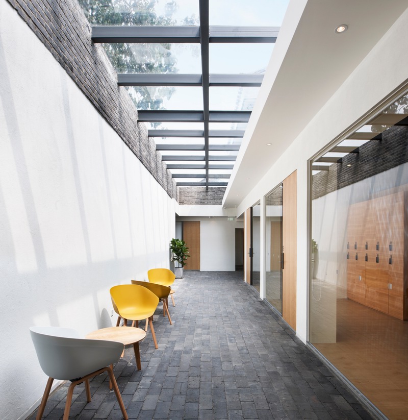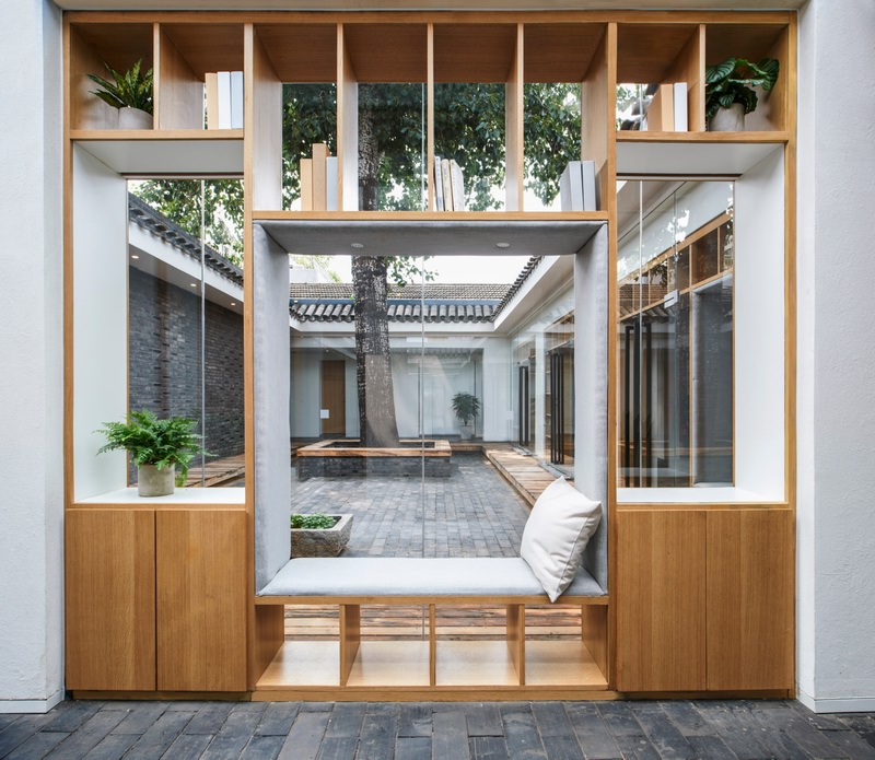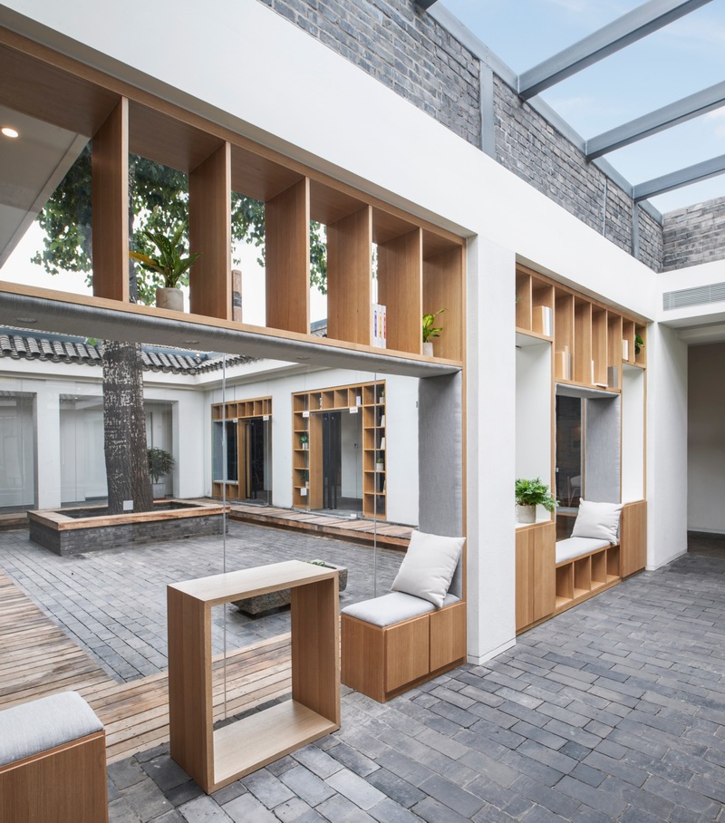 前院东侧通道为可供休憩的共享廊道空间,这条公共走廊使城市和胡同的街道得以延长,形成“半户外街道”式的全新空间,灰砖与公共家具既成为连接着过去的桥梁,也将胶囊空间变成一个真正的“家”。整条廊道贯穿前、后院,利用落地窗,隔而不断,框取庭院风光。游走长廊时仿若置身悠长的胡同,原本陌生的游客、住客、邻里不自觉停驻于此邂逅交流。更能以具有流动性的书本为媒介,通过公共家具的引导带来别具趣味的“交流”。