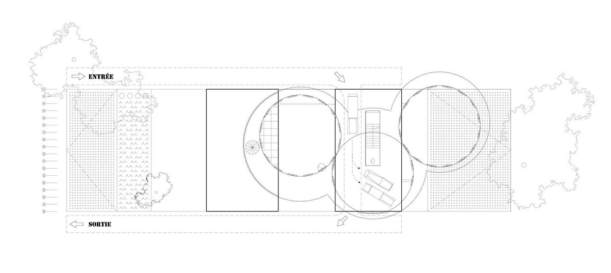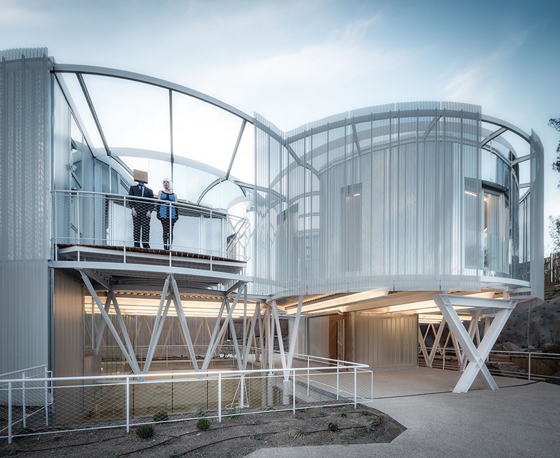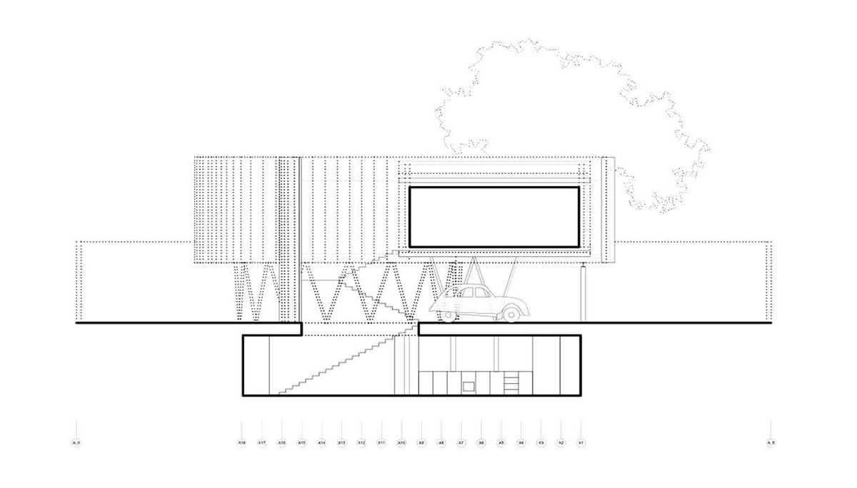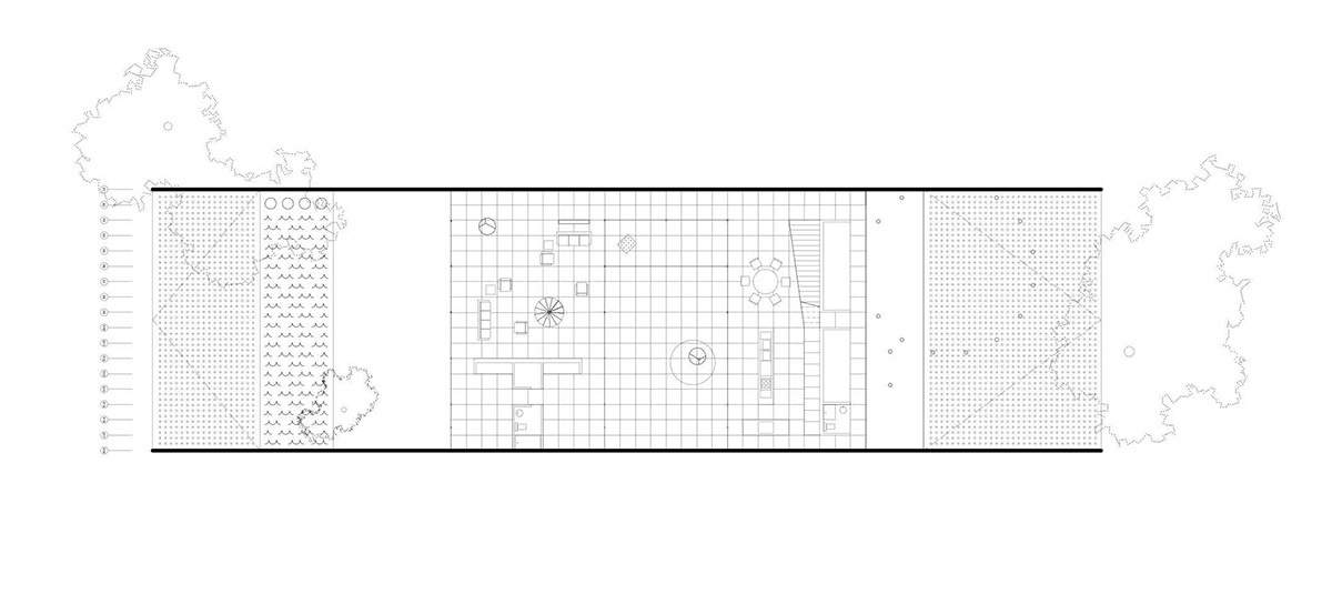 设计团队于是创作出了两个几乎完全分离的空间,一个下沉的庭院空间,一直延伸到建筑外部,以及三个被架空起来的钢结构建筑体。有建筑覆盖的下沉部分作为起居室,光线通过两个空间的缝隙进入这里,形成一处非常舒适、私密的半室外起居室。另外一半院子完全露天,设置了草地和泳池。