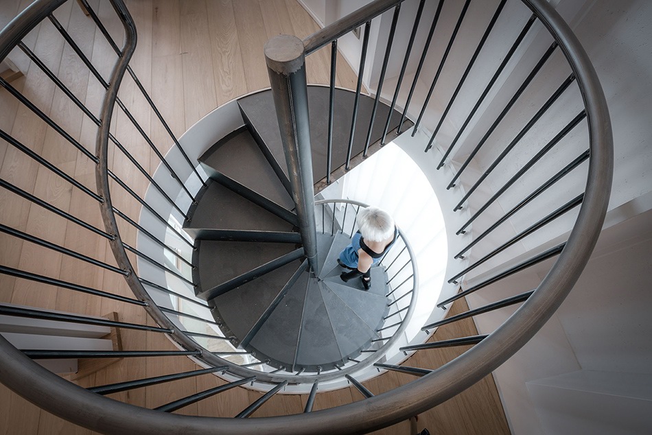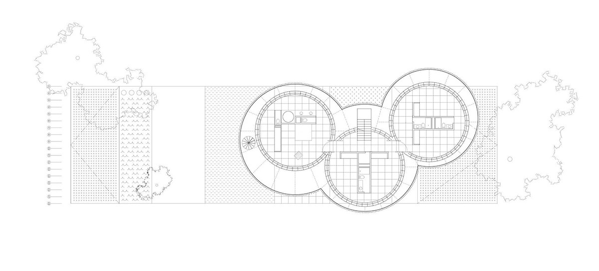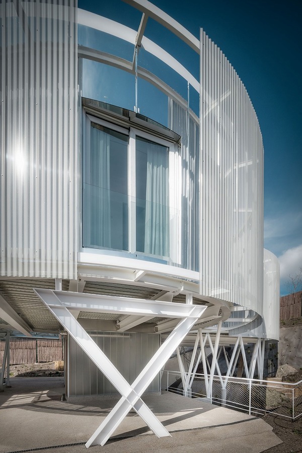 飘浮于上部的空间采用钢构架搭建,轻巧二精致,大量白色的应用让这三块圆柱体看上去仿佛是天上掉下来的一朵浮云。“浮云”内部提供了无间卧室、相应的卫生间以及一处宽大的室外阳台。