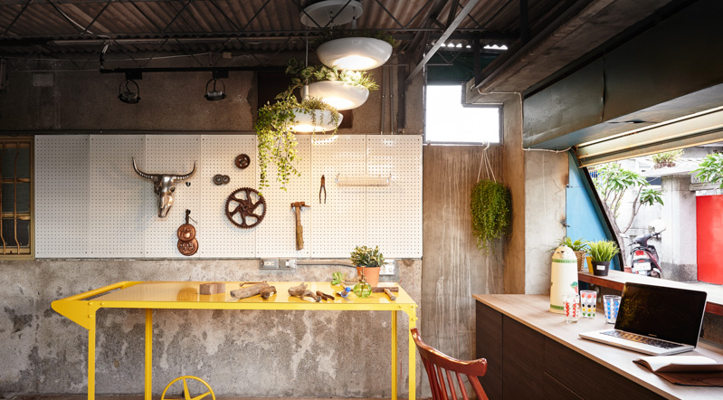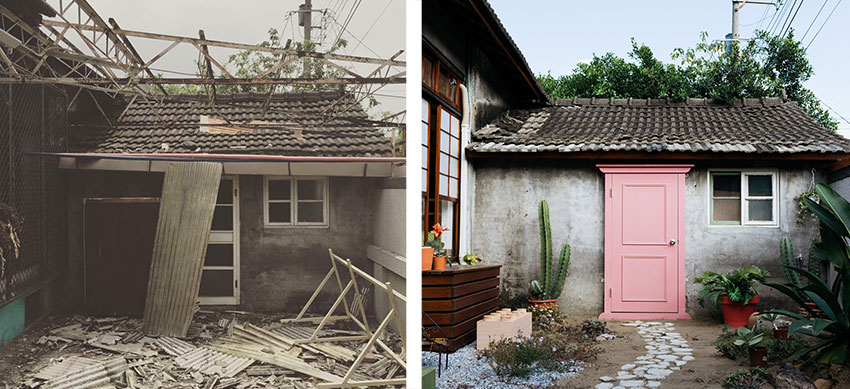 虽然对于改造老屋充满期待,但在接手时,眼前屋况破旧、水电全断。考虑到建筑的历史意义与特殊文化价值的存在,关于是否能够在不破坏的状态下,创造出新的空间感,是团队不时思考的。譬如日式房舍的屋瓦为外观一大特色,但在整建时,却面临屋顶漏水问题,必须先做好防水层,再整理屋瓦;而原本眷村象征性的红色大门,接手时已为较现代感的铝材质大门,最后将其连结高雄的工业城特质,以货柜的元素来表现红色大门,呈现高雄的风景的缩影。