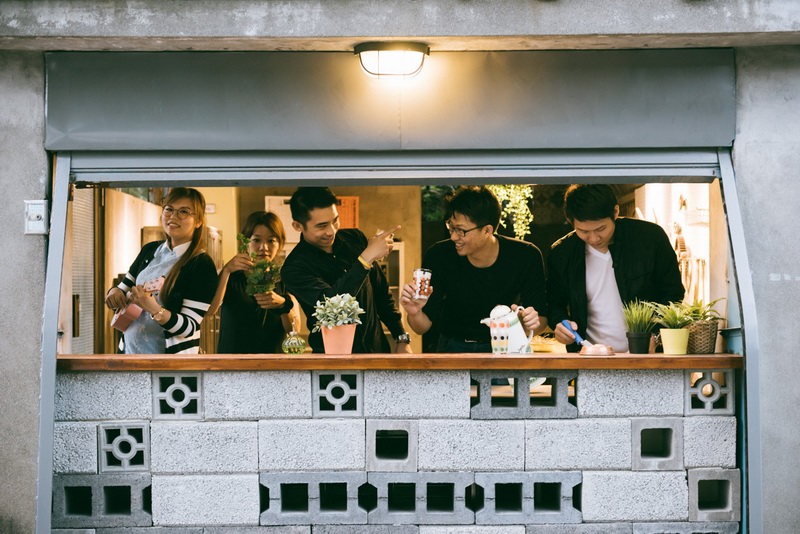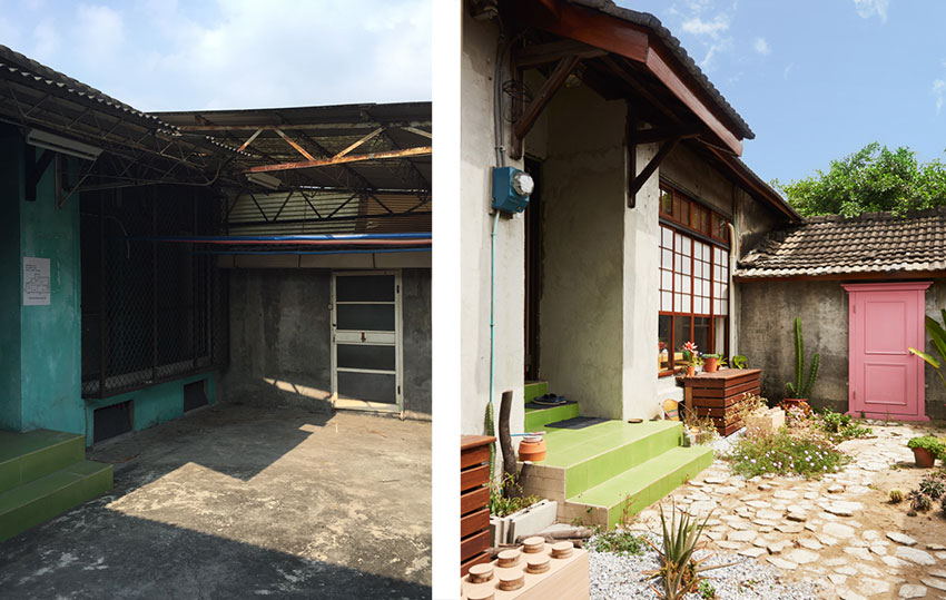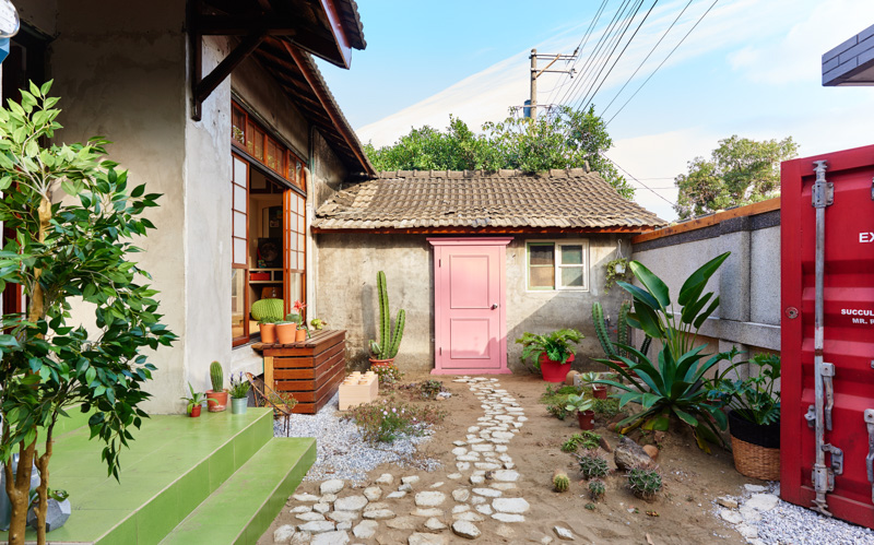从货柜门走进眷永堂,虽然行走至玄关的距离不长,但我们试图铺排了路径,以做为通往不同的空间的指引。团队成员透过水泥翻模,灌出一片片的“步道”,而几个小角落使用园艺用的碎石与沙,豢养符合南国气候的热带植栽。门口小庭院景观布局,含多肉植物、爬墙虎、金虎、小仙人掌、龙舌兰、天堂鸟等植物,为老空间加入绮想与活力。