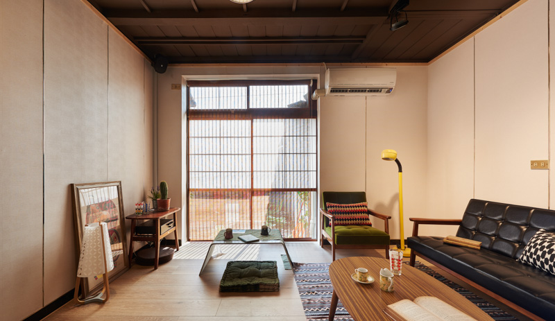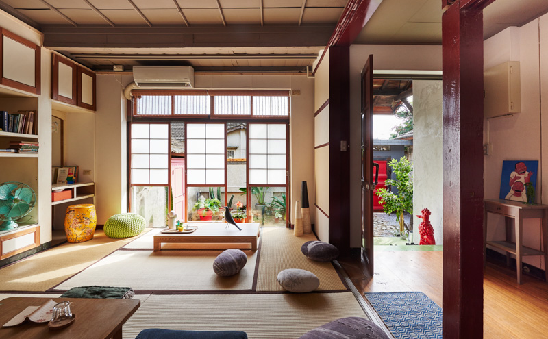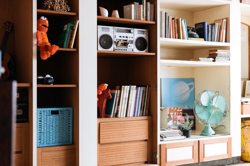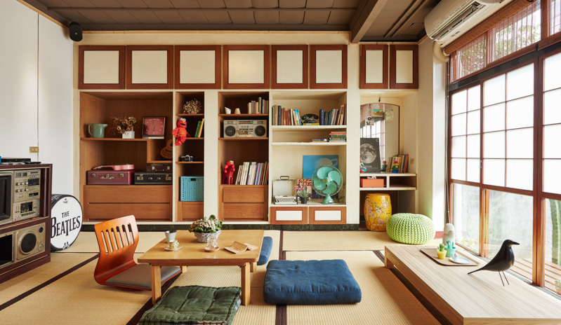 沿着保留的绿色玄关进入室内,让人回忆起日式房舍架高的特质。原为主卧房的和室,是眷永堂主要空间,壁面保存了完整的衣柜,将侧面门板移除后,正好形成了机能完备的壁柜,可摆放书籍,并展示收音机、打字机、花器与皮箱等布置物。