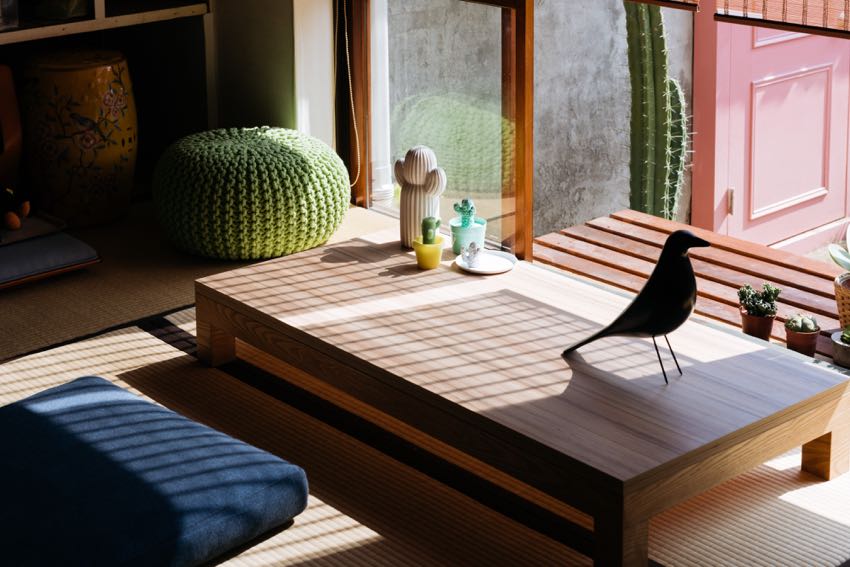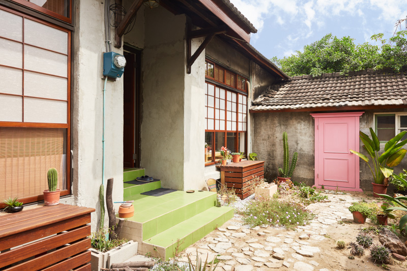 此外,在面庭院一侧,以木栈板打造接邻推拉门的小平台,除包覆室外机,也抓住日式平房具备户外平台的休憩特色,人们可坐在这里透透气,吹吹凉风,享受小平台所制造的悠闲。至于一般日式平房常见的石阶,在眷永堂,则藉由防水木作打造的“乐高积木”,搭配一旁粉红色的小门,为庭院创造趣味,希望带给空间丰富的想象。