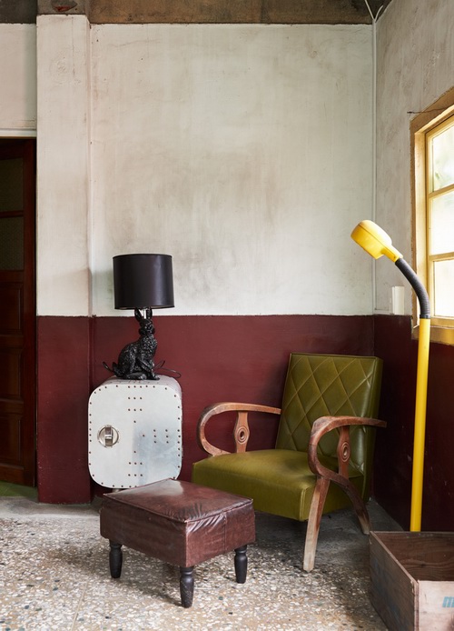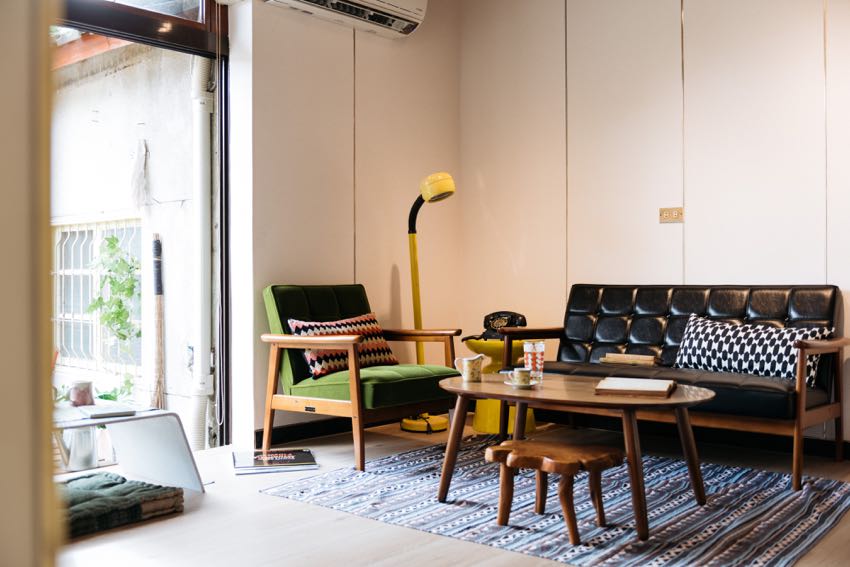 至于接待室,保留了房舍的原屋顶、磨石子地板,以及啡色墙面,保有旧时代的简练美好,我们在此处使用轨道灯布局,将其定义为展览空间,并使用了台湾 50 年代,拥有木头 R 字型卡榫的扶手椅、样式于 60 年代十分风行的日本经典 Karimoku 沙发、带点普普风的 70 年代台湾喇叭椅、彰显着太空时代特色的黄色立灯,并以一细致老药柜、藤茶几坐镇,让空间勾勒出对老时光的回味,也以台、日元素对照、混搭,展现出独特却不冲突的感受。